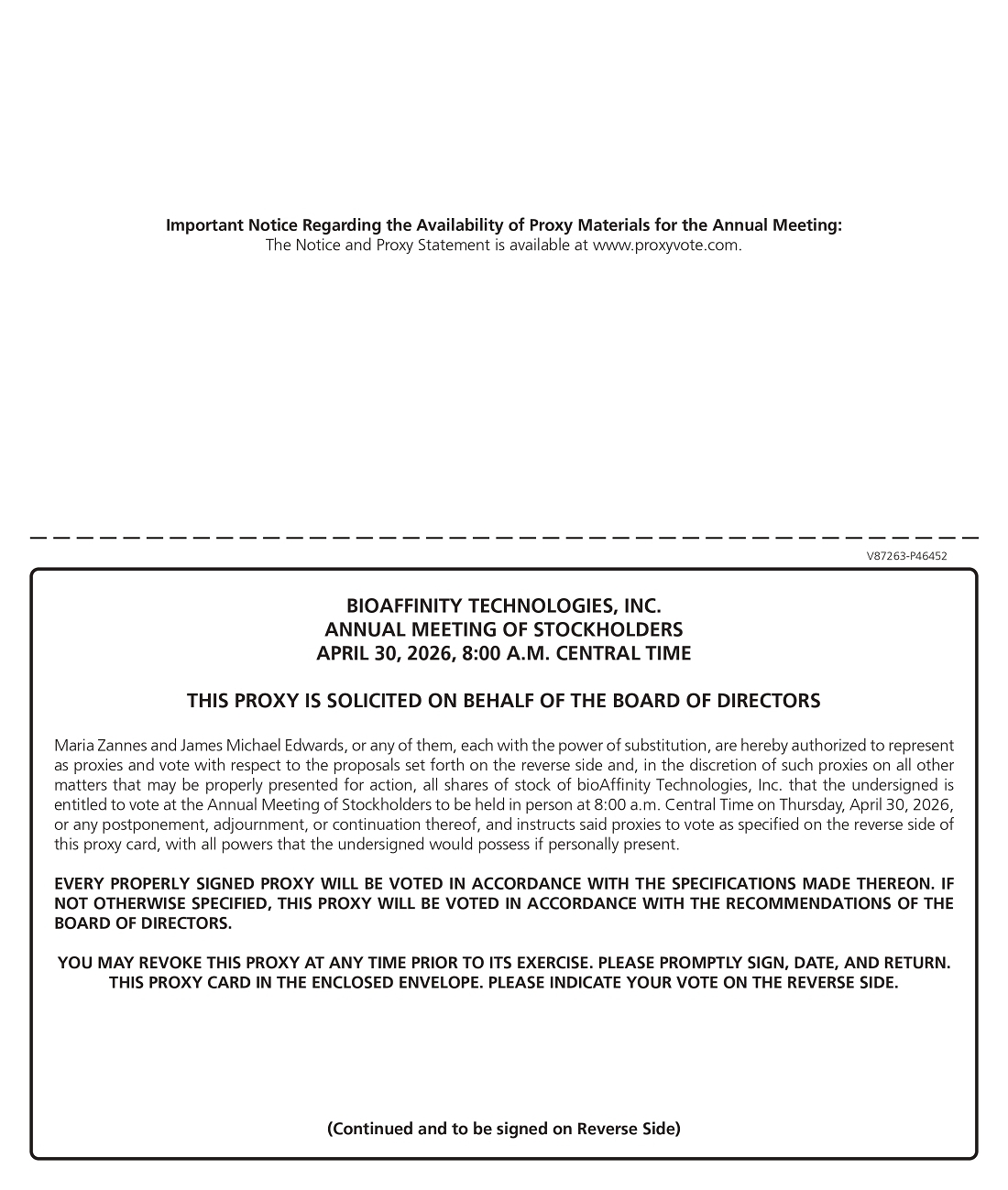 I am pleased to invite you to attend the Annual Meeting of Stockholders (the “Annual Meeting”) of bioAffinity Technologies, Inc. (the “Company” or “bioAffinity Technologies”) on Thursday, April 30, 2026, at 8:00 a.m. Central Time. The Annual Meeting will be held in person at the Company’s principal office at 3300 Nacogdoches Road, Suite 216, San Antonio, Texas 78217.