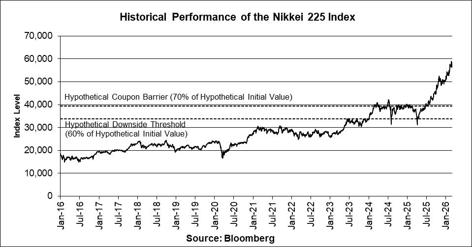 The graph below illustrates the daily performance of the Nikkei 225 Index from January 4, 2016 through March 3, 2026, based on information from Bloomberg, without independent verification. The closing level of the Nikkei 225 Index on March 3, 2026 was 56,279.05. The actual Initial Value of the Nikkei 225 Index will be the closing level of the Nikkei 225 Index on the Trade Date. We obtained the closing levels of the Nikkei 225 Index above and below from Bloomberg, without independent verification.