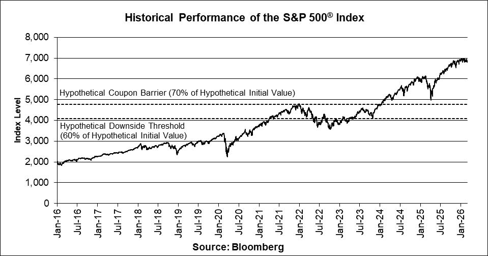 The graph below illustrates the daily performance of the S&P 500® Index from January 4, 2016 through March 3, 2026, based on information from Bloomberg, without independent verification. The closing level of the S&P 500® Index on March 3, 2026 was 6,816.63. The actual Initial Value of the S&P 500® Index will be the closing level of the S&P 500® Index on the Trade Date. We obtained the closing levels of the S&P 500® Index above and below from Bloomberg, without independent verification.