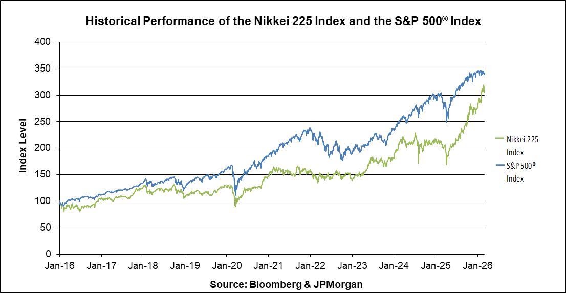The graph below illustrates the daily performance of the Nikkei 225 Index and the S&P 500® Index from January 4, 2016 through March 3, 2026. For comparison purposes, each Underlying has been normalized to have a closing level of 100.00 on January 4, 2016 by dividing the closing level of that Underlying on each day by the closing level of that Underlying on January 4, 2016 and multiplying by 100.00. We obtained the closing levels used to determine the normalized closing levels set forth below from Bloomberg, without independent verification.