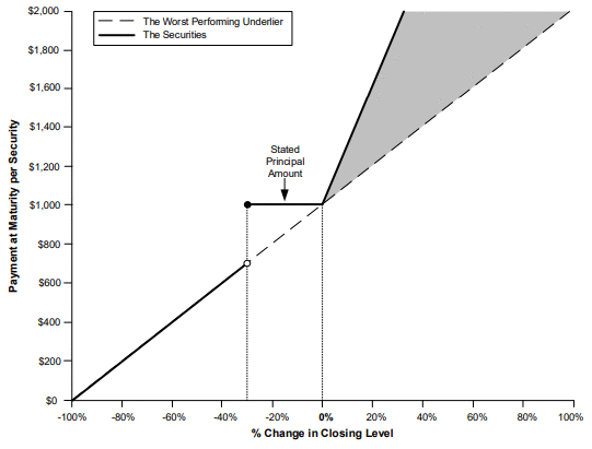 ■Downside Scenario. If the final level of the worst performing underlier is less than its downside threshold level, investors will receive an amount that is significantly less than the stated principal amount, based on a 1% loss of principal for every 1% decline in the level of the worst performing underlier. There is no minimum payment at maturity, and investors could lose their entire initial investment in the securities.