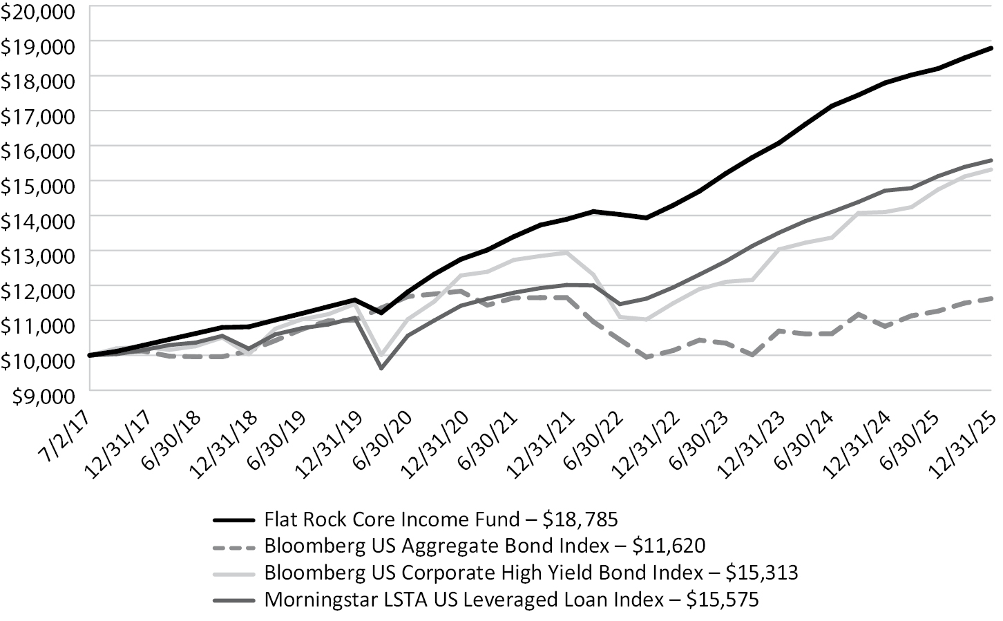Flat Rock Core Income Fund (“CORFX” or the “Fund”) finished 2025 with a return of 5.57%. The Fund paid $1.97 per share in dividends and experienced a $0.88 decline in net asset value (“NAV”) per share during the year. Defaults in the loan market were elevated during the year, with a peak default rate of 5.2% in January, which exceeded the Covid-era peak of 4.7%. We were not immune from the market’s higher default rate. The largest drivers of CORFX’s NAV decline were a litigation finance loan and a collateralized loan obligation (“CLO”) managed by Blackrock. We finished the year with 1.4% of the direct lending portfolio marked below 80.