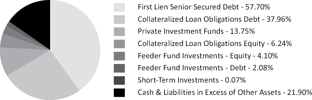 The Fund holds 60 positions across private credit issuers, as well as in the equity and junior debt tranches of CLOs, providing exposure to more than 1,400 first lien secured loans. The loans in the Fund are almost exclusively floating rate. The Fund ended 2025 with $394 million of assets under management and a conservative leverage ratio (debt-to-total assets) of 0.24x.