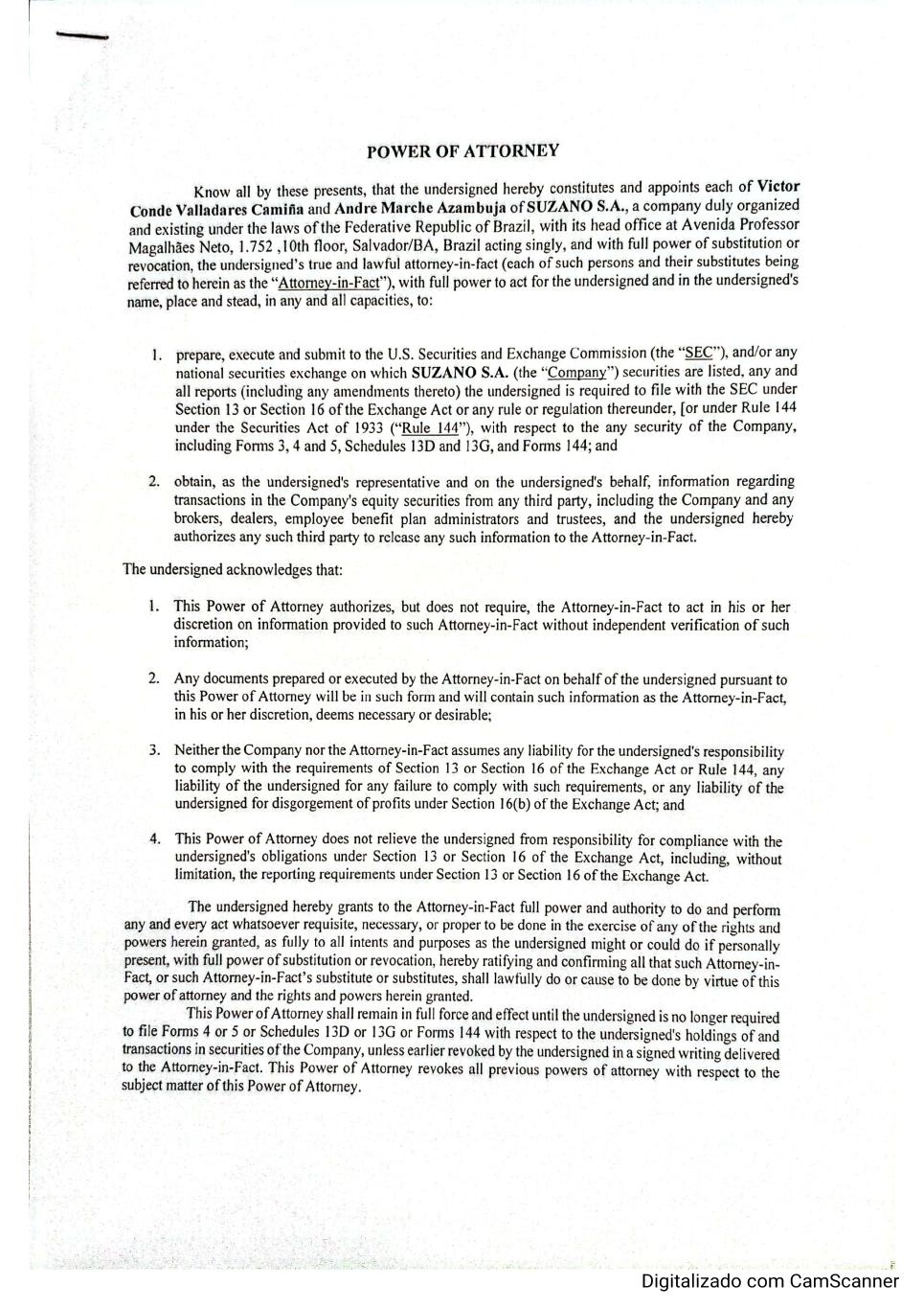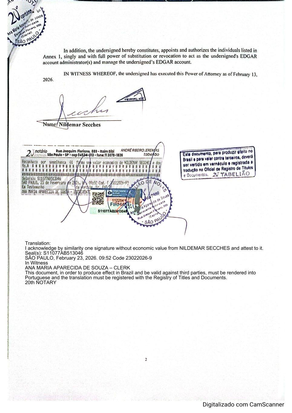 Translation: I acknowledge by similarity one signature without economic value from NILDEMAR SECCHES and attest to it. Seal(s): S11077AB513046 SÃO PAULO, February 23, 2026. 09:52 Code 23022026-9 In Witness ANA MARIA APARECIDA DE SOUZA – CLERK This document, in order to produce effect in Brazil and be valid against third parties, must be rendered into Portuguese and the translation must be registered with the Registry of Titles and Documents. 20th NOTARY