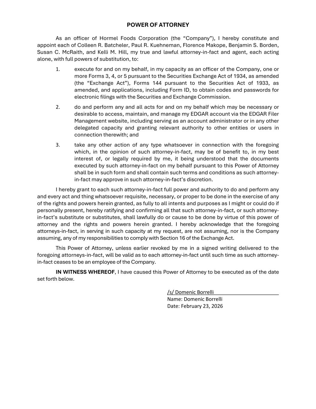POWER OF ATTORNEY As an officer of Hormel Foods Corporation (the “Company”), I hereby constitute and appoint each of Colleen R. Batcheler, Paul R. Kuehneman, Florence Makope, Benjamin S. Borden, Susan C. McRaith, and Kelli M. Hill, my true and lawful attorney-in-fact and agent, each acting alone, with full powers of substitution, to: 1. execute for and on my behalf, in my capacity as an officer of the Company, one or more Forms 3, 4, or 5 pursuant to the Securities Exchange Act of 1934, as amended (the “Exchange Act”), Forms 144 pursuant to the Securities Act of 1933, as amended, and applications, including Form ID, to obtain codes and passwords for electronic filings with the Securities and Exchange Commission. 2. do and perform any and all acts for and on my behalf which may be necessary or desirable to access, maintain, and manage my EDGAR account via the EDGAR Filer Management website, including serving as an account administrator or in any other delegated capacity and granting relevant authority to other entities or users in connection therewith; and 3. take any other action of any type whatsoever in connection with the foregoing which, in the opinion of such attorney-in-fact, may be of benefit to, in my best interest of, or legally required by me, it being understood that the documents executed by such attorney-in-fact on my behalf pursuant to this Power of Attorney shall be in such form and shall contain such terms and conditions as such attorney- in-fact may approve in such attorney-in-fact’s discretion. I hereby grant to each such attorney-in-fact full power and authority to do and perform any and every act and thing whatsoever requisite, necessary, or proper to be done in the exercise of any of the rights and powers herein granted, as fully to all intents and purposes as I might or could do if personally present, hereby ratifying and confirming all that such attorney-in-fact, or such attorney- in-fact’s substitute or substitutes, shall lawfully do or cause to be done by virtue of this power of attorney and the rights and powers herein granted. I hereby acknowledge that the foregoing attorneys-in-fact, in serving in such capacity at my request, are not assuming, nor is the Company assuming, any of my responsibilities to comply with Section 16 of the Exchange Act. This Power of Attorney, unless earlier revoked by me in a signed writing delivered to the foregoing attorneys-in-fact, will be valid as to each attorney-in-fact until such time as such attorney- in-fact ceases to be an employee of the Company. IN WITNESS WHEREOF, I have caused this Power of Attorney to be executed as of the date set forth below. /s/ Domenic Borrelli Name: Domenic Borrelli Date: February 23, 2026