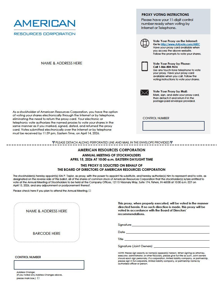 We are pleased to invite you to attend this year’s annual shareholder meeting, which is scheduled to be held on April 15, 2026, at 9:00 AM Eastern Time at American Resources Corporation’s corporate headquarters located at 12115 Visionary Way, Suite 174, Fishers, IN 46038.