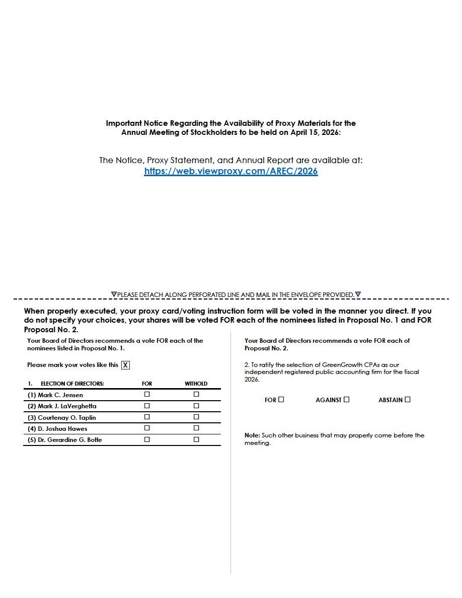 Our Board of Directors is soliciting proxies to be voted at the 2026 Annual Meeting of Shareholders. Voting by Shareholders will occur during the Annual Meeting, through the mailing of the enclosed proxy card, with those proxy cards received by the time of our Annual Meeting being counted as part of our Shareholder vote, by telephone or online at http://www.AALvote.com/AREC, provided that any online votes are cast prior to the time of our Annual Meeting to be counted as part of our Shareholder vote. Each share of common stock of the Company entitles the holder to one vote at the Annual Meeting. You may vote either by attending the meeting in person, by voting online, or by proxy. For specific voting information, please see “Frequently Asked Questions About Voting” beginning on page 1 of the Proxy Statement that follows. Whether or not you plan to attend the meeting, we hope you will vote as soon as possible.