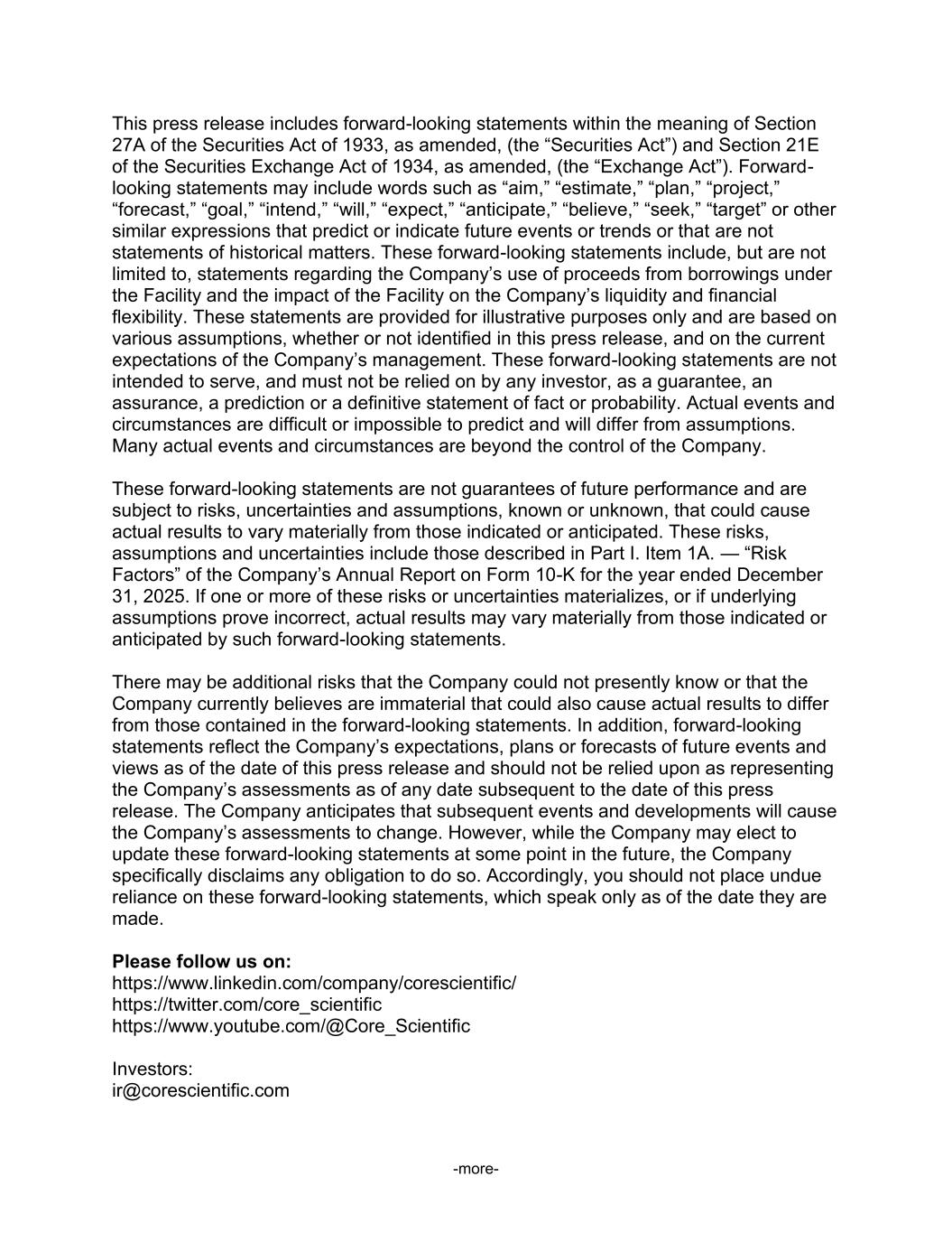 -more- This press release includes forward-looking statements within the meaning of Section 27A of the Securities Act of 1933, as amended, (the “Securities Act”) and Section 21E of the Securities Exchange Act of 1934, as amended, (the “Exchange Act”). Forward- looking statements may include words such as “aim,” “estimate,” “plan,” “project,” “forecast,” “goal,” “intend,” “will,” “expect,” “anticipate,” “believe,” “seek,” “target” or other similar expressions that predict or indicate future events or trends or that are not statements of historical matters. These forward-looking statements include, but are not limited to, statements regarding the Company’s use of proceeds from borrowings under the Facility and the impact of the Facility on the Company’s liquidity and financial flexibility. These statements are provided for illustrative purposes only and are based on various assumptions, whether or not identified in this press release, and on the current expectations of the Company’s management. These forward-looking statements are not intended to serve, and must not be relied on by any investor, as a guarantee, an assurance, a prediction or a definitive statement of fact or probability. Actual events and circumstances are difficult or impossible to predict and will differ from assumptions. Many actual events and circumstances are beyond the control of the Company. These forward-looking statements are not guarantees of future performance and are subject to risks, uncertainties and assumptions, known or unknown, that could cause actual results to vary materially from those indicated or anticipated. These risks, assumptions and uncertainties include those described in Part I. Item 1A. — “Risk Factors” of the Company’s Annual Report on Form 10-K for the year ended December 31, 2025. If one or more of these risks or uncertainties materializes, or if underlying assumptions prove incorrect, actual results may vary materially from those indicated or anticipated by such forward-looking statements. There may be additional risks that the Company could not presently know or that the Company currently believes are immaterial that could also cause actual results to differ from those contained in the forward-looking statements. In addition, forward-looking statements reflect the Company’s expectations, plans or forecasts of future events and views as of the date of this press release and should not be relied upon as representing the Company’s assessments as of any date subsequent to the date of this press release. The Company anticipates that subsequent events and developments will cause the Company’s assessments to change. However, while the Company may elect to update these forward-looking statements at some point in the future, the Company specifically disclaims any obligation to do so. Accordingly, you should not place undue reliance on these forward-looking statements, which speak only as of the date they are made. Please follow us on: https://www.linkedin.com/company/corescientific/ https://twitter.com/core_scientific https://www.youtube.com/@Core_Scientific Investors: ir@corescientific.com