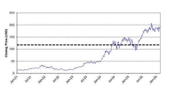 | NVIDIA Corporation common stock — daily closing prices* January 4, 2021 to March 4, 2026 |