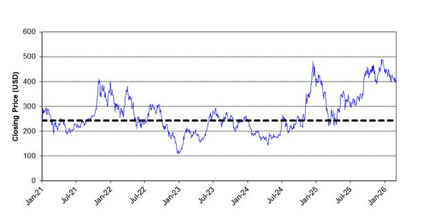 The following graph shows the daily closing prices of the common stock of Tesla, Inc. for the period specified below. The closing price of the common stock of Tesla, Inc. on March 4, 2026 was $405.94. We obtained the closing prices of the common stock of Tesla, Inc. from Bloomberg, without independent verification. Historical performance of the common stock of Tesla, Inc. should not be taken as an indication of future performance. Future performance of the common stock of Tesla, Inc. may differ significantly from historical performance, and no assurance can be given as to the closing price of the common stock of Tesla, Inc. during the term of the securities, including on any of the determination dates. We cannot give you assurance that the performance of the common stock of Tesla, Inc. will not result in a loss on your initial investment. The closing prices below may reflect adjustments in response to certain corporate actions, such as stock splits, public offerings, mergers and acquisitions, spin-offs, extraordinary dividends, delistings and bankruptcy.