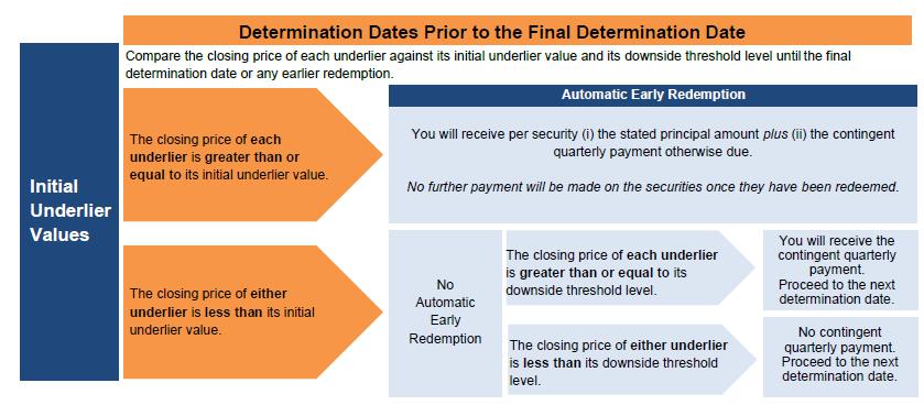 | Automatic early redemption: | If, on any determination date (other than the final determination date), the closing price of each underlier is greater than or equal to its initial underlier value, the securities will be automatically redeemed for an early redemption payment on the contingent payment date immediately following that determination date. The securities will not be redeemed early if the closing price of either underlier is less than its initial underlier value on the related determination date. No further payments will be made on the securities after they have been redeemed. |