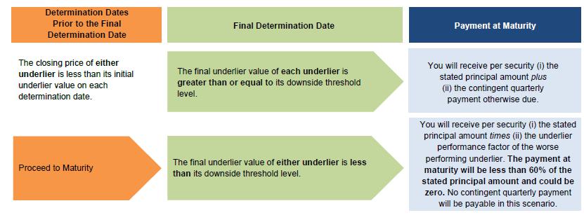 The securities are for investors who are willing and able to risk their principal and forgo guaranteed interest payments, in exchange for the opportunity to potentially receive contingent quarterly payments at an above-market rate, subject to automatic early redemption. The securities offer investors an opportunity to receive a contingent quarterly payment of $57.25 (5.725% of the stated principal amount) with respect to each determination date on which the closing price of each underlier is greater than or equal to its downside threshold level. In addition, the following scenarios reflect the potential payment on the securities, if any, upon an automatic early redemption or at maturity: