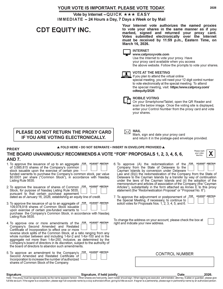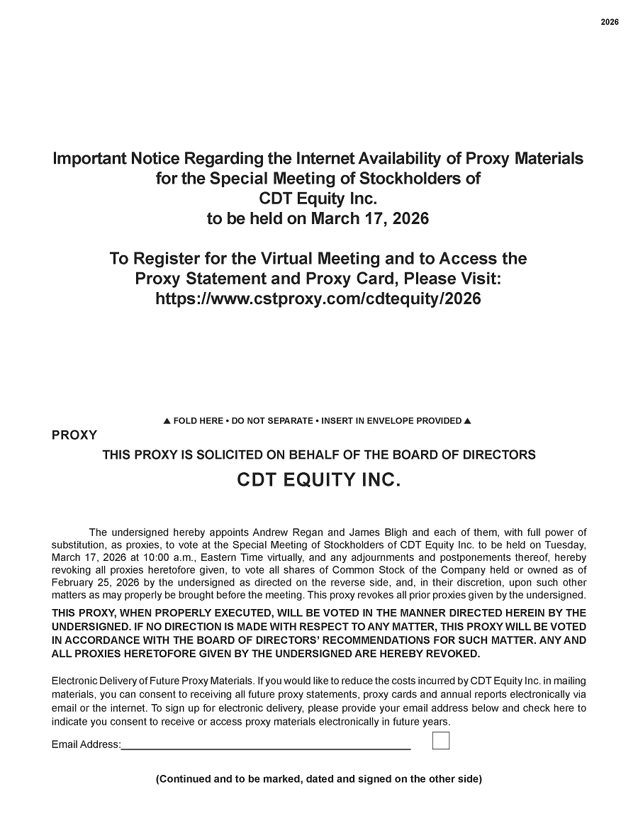 The 2026 virtual special meeting of stockholders (the “Special Meeting”) of CDT Equity Inc., a Delaware corporation, will be held on Tuesday, March 17, 2026, at 10:00 a.m., Eastern Time, for the following purpose: