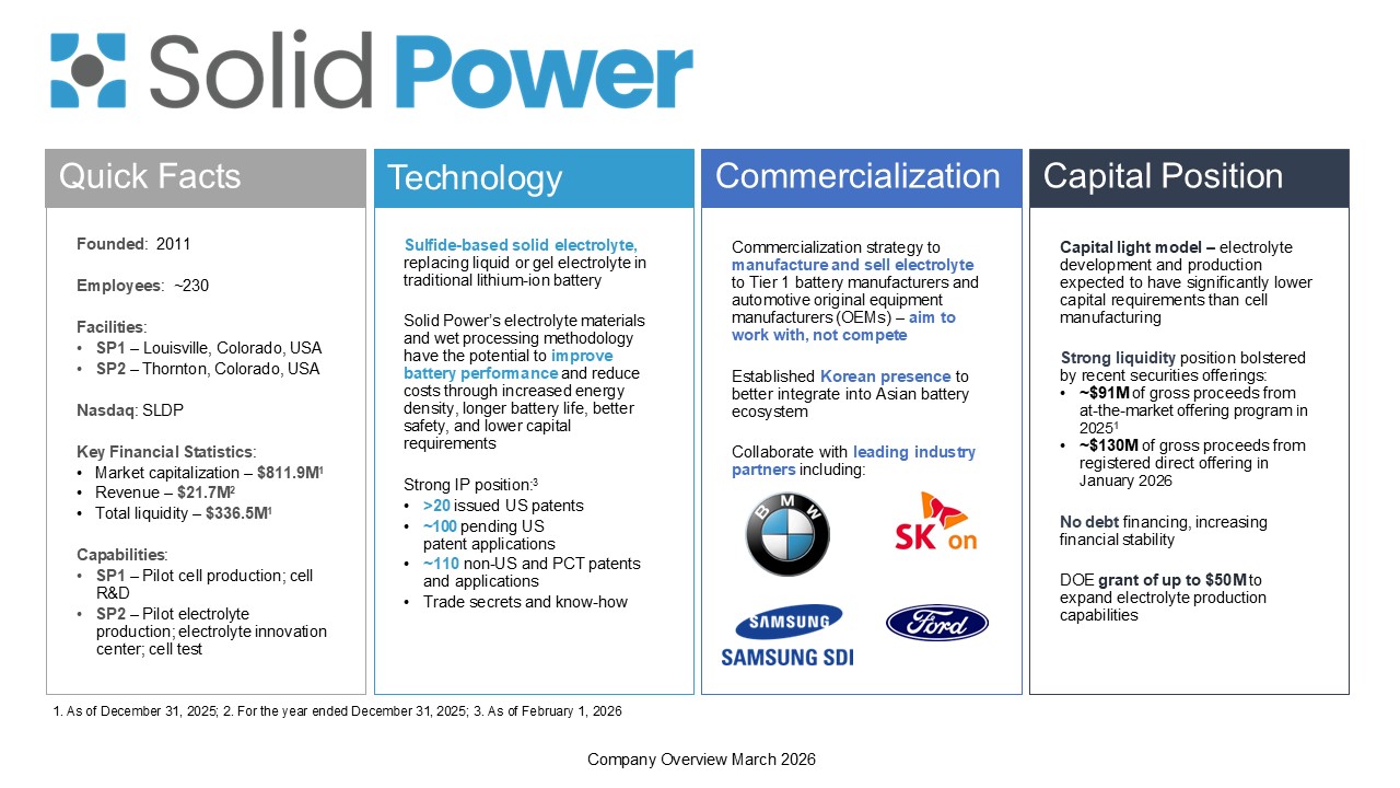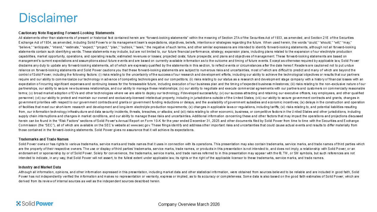 Cautionary Note Regarding Forward - Looking Statements All statements other than statements of present or historical fact contained herein are “forward - looking statements” within the meaning of Section 27A of the Securities Act of 1933, as amended, and Section 21E of the Securities Exchange Act of 1934, as amended, including Solid Power’s or its management team’s expectations, objectives, beliefs, intenti ons or strategies regarding the future. When used herein, the words “could,” “should,” “will,” “may,” “believe,” “anticipate,” “intend,” “estimate,” “expect,” “project,” “plan,” “outlook,” “seek,” the negative of such terms, an d o ther similar expressions are intended to identify forward - looking statements, although not all forward - looking statements contain such identifying words. These statements may include, but are not limited to, our future financial performance, strategy, expansion plans, including plans related to the expansion of our electrolyte production capabilities, market opportunity, operations, and operating results; estimated revenues or losses; projected costs ; future prospects; and plans and objectives of management. These forward - looking statements are based on management’s current expectations and assumptions about future events and are based on currently available information as to the outcome and timing of future events. Except as otherwise required by applicable law, Solid Power disclaims any duty to update any forward - looking statements, all of which are expressly qualified by the statements in this sect ion, to reflect events or circumstances after the date hereof. Readers are cautioned not to put undue reliance on forward - looking statements and Solid Power cautions you that these forward - looking statements are subject to numerou s risks and uncertainties, most of which are difficult to predict and many of which are beyond the control of Solid Power, including the following factors: ( i ) risks relating to the uncertainty of the success of our research and development efforts, including our ability to achieve th e t echnological objectives or results that our partners require and our ability to commercialize our technology in advance of competing technologies and our competitors; (ii) risks relating to our status as a research and development stage company with a history of financial losses with an expectation of incurring significant expenses and continuing losses for the foreseeable future, including execution of our bu sin ess plan and the timing of expected business milestones; (iii) risks relating to the non - exclusive nature of our partnerships, our ability to secure new business relationships, and our ability to manage these relationships; (iv) our ability to negotiate and execute commercial agreements with our partners and customers on commercially reasonable terms; (v) broad market adoption of EVs and other technologies where we are able to deploy our technology, if developed successfully; (v i) our success attracting and retaining our executive officers, key employees, and other qualified personnel; (vii) our ability to protect and maintain our owned and exclusively - licensed intellectual property, including in jurisdictions outside of the United States; (viii) our ability to secure government contracts and grants, changes in government priorities with respect to our government contracts and grants or government funding reductions or delays, and the av ailability of government subsidies and economic incentives; (ix) delays in the construction and operation of facilities that meet our short - term research and development and long - term electrolyte production requirements; (x) changes in applicable laws or regulations , including tariffs ; (xi) risks relating to , and potential liabilities resulting from, our information technology infrastructure and data security incidents, threats, breaches , or attacks ; and (xii) risks relating to other economic, business, or competitive factors in the United States and other jurisdictions, including supply chain interruptions and changes in market conditions, and our ability to manage these risks and uncertainties . Additional information concerning these and other factors that may impact the operations and projections discussed herein can be found in the “Risk Factors” sections of Solid Power’s Annual Report on Form 10 - K for the year ended December 31, 2025 and other documents filed by Solid Power from time to time with the Securities and Exchange Commission (the “SEC”), all of which are available on the SEC’s website at www.sec.gov. These filings identify and address ot her important risks and uncertainties that could cause actual events and results to differ materially from those contained in the forward - looking statements. Solid Power gives no assurance that it will achieve its expectations. Trademarks and Trade Names Solid Power owns or has rights to various trademarks, service marks and trade names that it uses in connection with its opera tio ns. This presentation may also contain trademarks, service marks, and trade names of third parties which are the property of their respective owners. The use or display of third parties’ trademarks, service marks, trade names, or pro ducts in this presentation is not intended to, and does not imply, a relationship with Solid Power, or an endorsement or sponsorship by or of Solid Power. Solely for convenience, the trademarks, service marks, and trade names refer red to in this presentation may appear with the ®, TM, or SM symbols, but such references are not intended to indicate, in any way, that Solid Power will not assert, to the fullest extent under applicable law, its rights or th e right of the applicable licensor to these trademarks, service marks, and trade names. Industry and Market Data Although all information, opinions, and other information expressed in this pr
