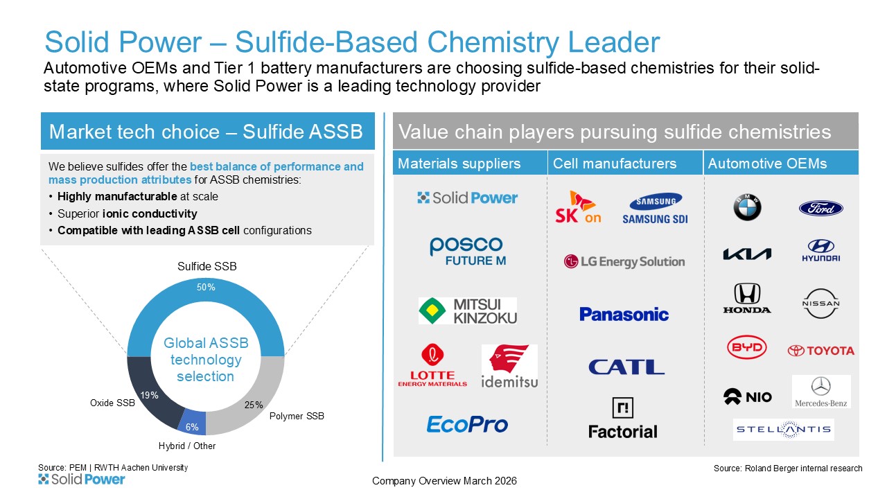 Solid Power – Sulfide - Based Chemistry Leader Materials suppliers Cell manufacturers Automotive OEMs Value chain players pursuing sulfide chemistries 50% 25% 6% 19% Sulfide SSB Polymer SSB Hybrid / Other Oxide SSB Global ASSB technology selection We believe sulfides offer the best balance of performance and mass production attributes for ASSB chemistries: • Highly manufacturable at scale • Superior ionic conductivity • Compatible with leading ASSB cell configurations Market tech choice – Sulfide ASSB Source: PEM | RWTH Aachen University Automotive OEMs and Tier 1 battery manufacturers are choosing sulfide - based chemistries for their solid - state programs, where Solid Power is a leading technology provider Source: Roland Berger internal research Company Overview March 2026