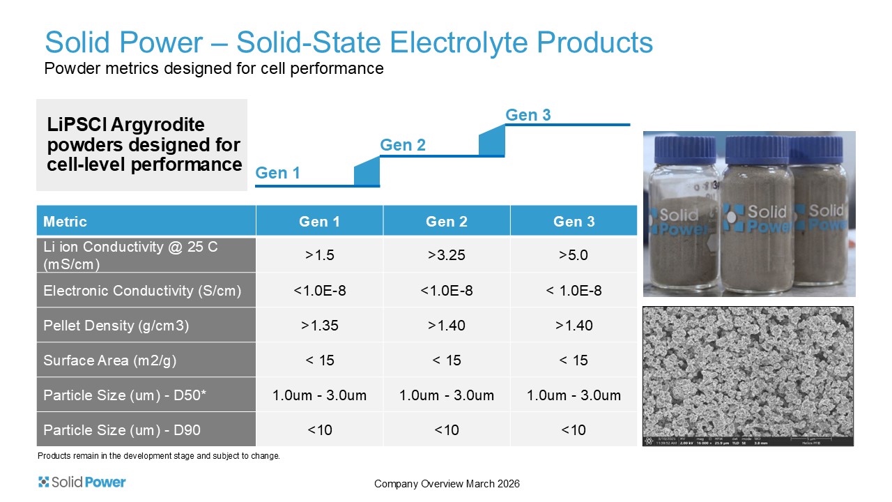 LiPSCl Argyrodite powders designed for cell - level performance Gen 1 Gen 2 Gen 3 Gen 3 Gen 2 Gen 1 Metric >5.0 >3.25 >1.5 Li ion Conductivity @ 25 C (mS/cm) < 1.0E - 8 <1.0E - 8 <1.0E - 8 Electronic Conductivity (S/cm) >1.40 >1.40 >1.35 Pellet Density (g/cm3) < 15 < 15 < 15 Surface Area (m2/g) 1.0um - 3.0um 1.0um - 3.0um 1.0um - 3.0um Particle Size (um) - D50* <10 <10 <10 Particle Size (um) - D90 Solid Power – Solid - State Electrolyte Products Company Overview March 2026 Powder metrics designed for cell performance Products remain in the development stage and subject to change.