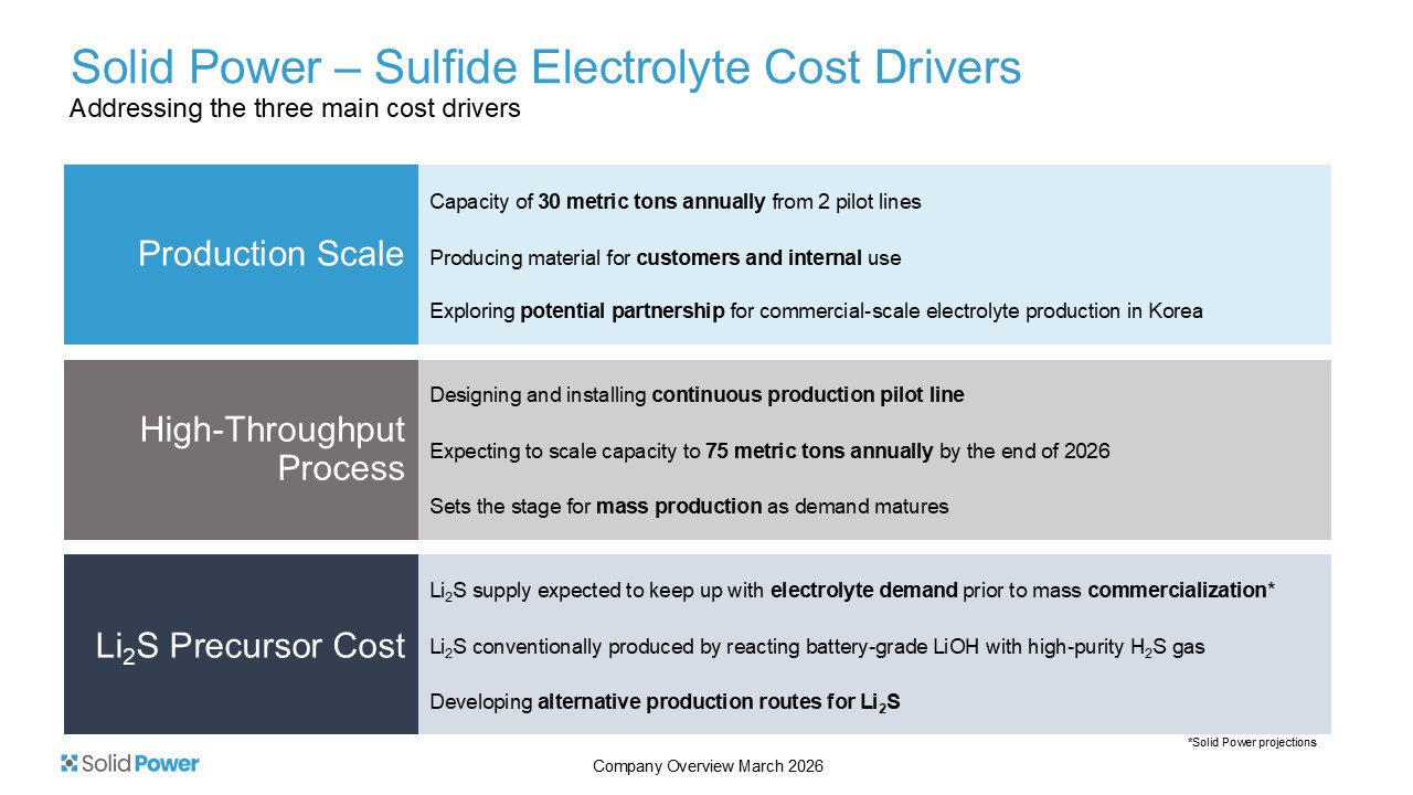 Solid Power – Sulfide Electrolyte Cost Drivers Li 2 S supply expected to keep up with electrolyte demand prior to mass commercialization * Li 2 S c onventionally produced by reacting battery - grade LiOH with high - purity H 2 S gas Developing alternative production routes for Li 2 S Capacity of 30 metric tons annually from 2 pilot lines Producing material for customers and internal use Exploring potential partnership for commercial - scale electrolyte production in Korea Leverage periodic, incremental adjustments to control environment and strong management execution expectations to proactively manage SOX program. Li 2 S Precursor Cost High - Throughput Process Production Scale Designing and installing continuous production pilot line Expecting to scale capacity to 75 metric tons annually by the end of 2026 Sets the stage for mass production as demand matures High - Throughput Process Production Scale *Solid Power projections Company Overview March 2026 Addressing the three main cost drivers