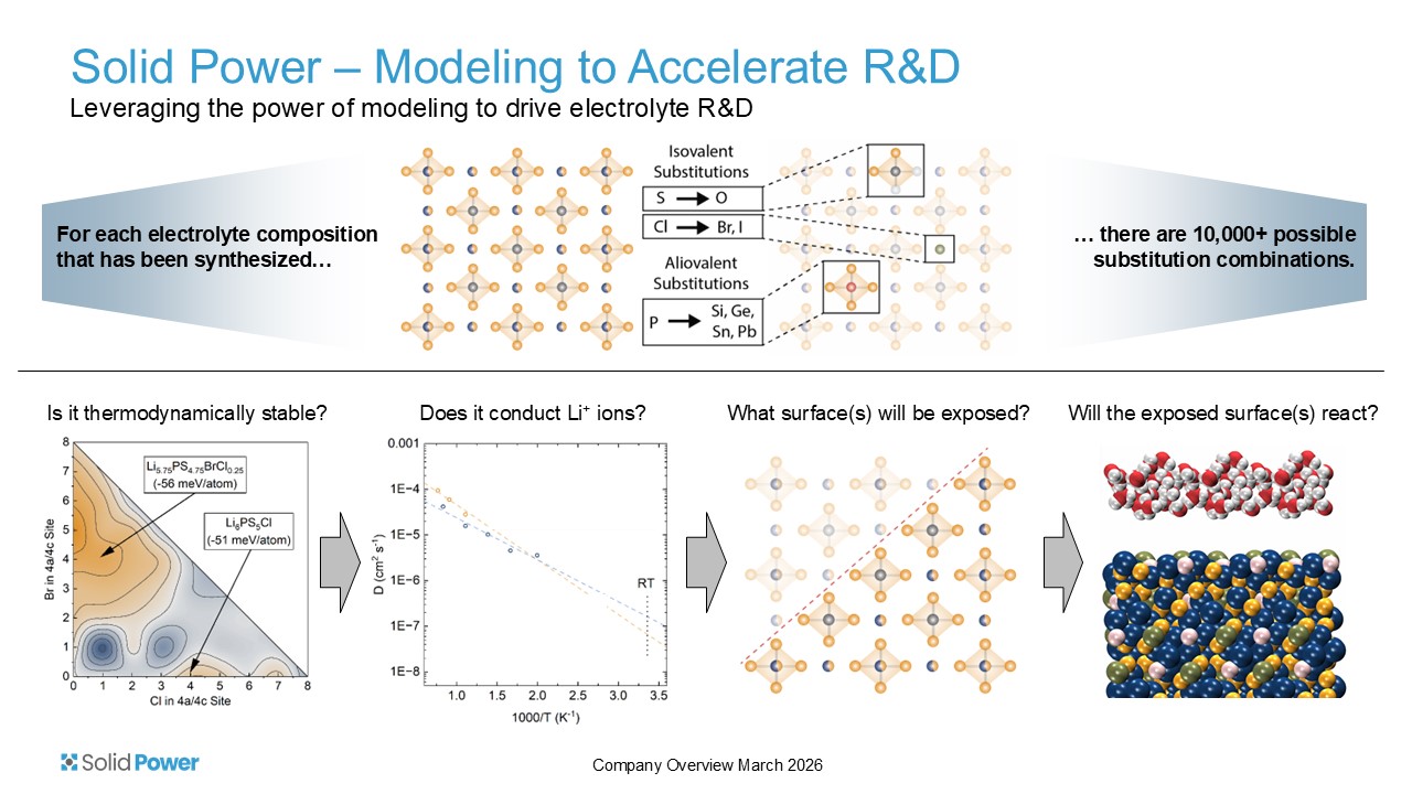Company Overview March 2026 Solid Power – Modeling to Accelerate R&D Is it thermodynamically stable? Does it conduct Li + ions? What surface(s) will be exposed? Will the exposed surface(s) react? For each electrolyte composition that has been synthesized… … there are 10,000+ possible substitution combinations. Leveraging the power of modeling to drive electrolyte R&D