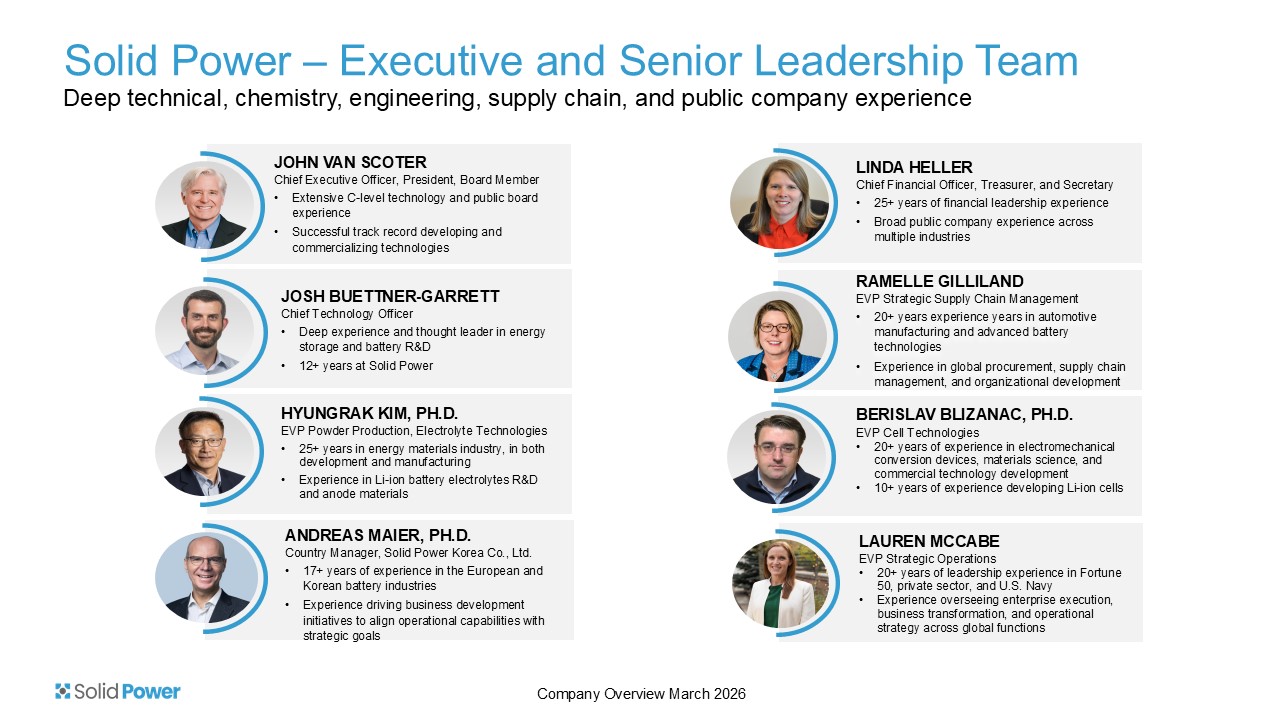 Solid Power – Executive and Senior Leadership Team Deep technical, chemistry, engineering, supply chain, and public company experience LINDA HELLER Chief Financial Officer, Treasurer, and Secretary • 25+ years of financial leadership experience • Broad public company experience across multiple industries BERISLAV BLIZANAC, PH.D. EVP Cell Technologies • 20+ years of experience in electromechanical conversion devices, materials science, and commercial technology development • 10+ years of experience developing Li - ion cells JOHN VAN SCOTER Chief Executive Officer, President, Board Member • Extensive C - level technology and public board experience • Successful track record developing and commercializing technologies HYUNGRAK KIM, PH.D. EVP Powder Production, Electrolyte Technologies • 25+ years in energy materials industry, in both development and manufacturing • Experience in Li - ion battery electrolytes R&D and anode materials JOSH BUETTNER - GARRETT Chief Technology Officer • Deep experience and thought leader in energy storage and battery R&D • 12+ years at Solid Power RAMELLE GILLILAND EVP Strategic Supply Chain Management • 20+ years experience years in automotive manufacturing and advanced battery technologies • Experience in global procurement, supply chain management, and organizational development ANDREAS MAIER, PH.D. Country Manager, Solid Power Korea Co., Ltd. • 17+ years of experience in the European and Korean battery industries • Experience driving business development initiatives to align operational capabilities with strategic goals LAUREN MCCABE EVP Strategic Operations • 20+ years of leadership experience in Fortune 50, private sector, and U.S. Navy • Experience overseeing enterprise execution, business transformation, and operational strategy across global functions Company Overview March 2026