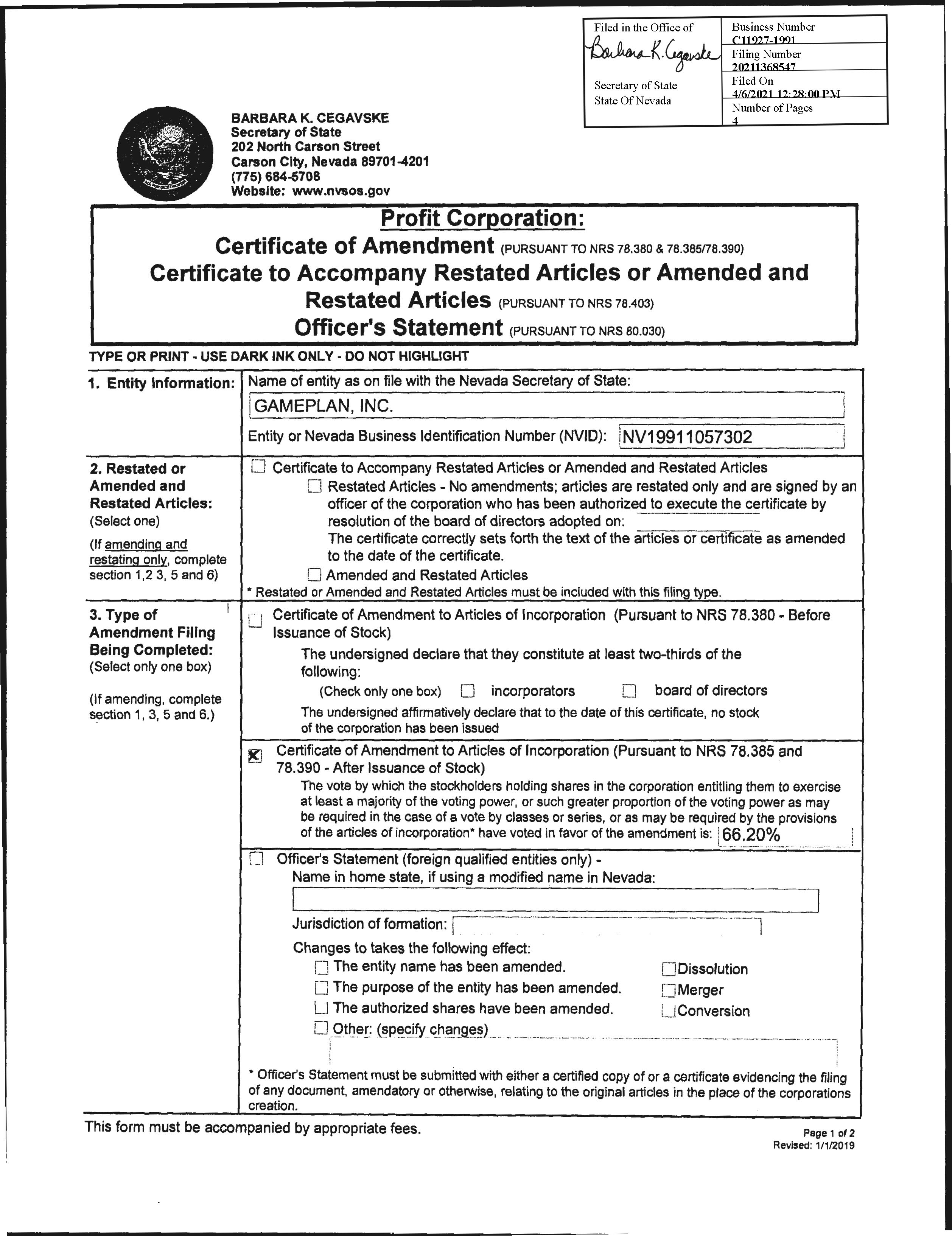 Filed in the Office of Secretary of State State Of Nevada Business Number C11927 - 1991 Filing Number 20211368547 Filed On 4/6/2021 12:28:00 PM Number of Pages 4