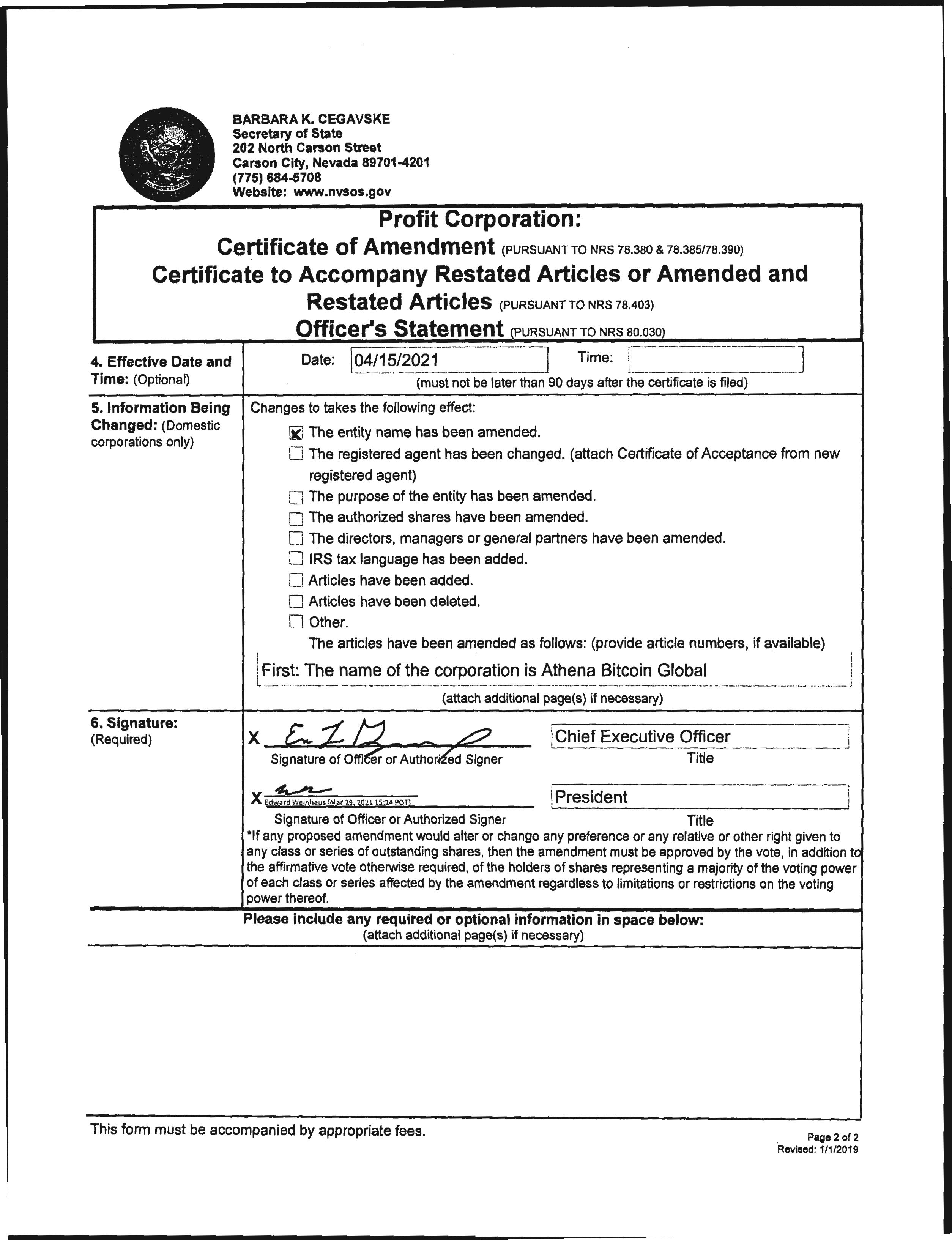 • BARBARA K. CEGAVSKE Secretary of State 202 North Carson Street Carson City, Nevada 89701 - 4201 (775) 684 - 5708 Website: www.nvsos.gov Profit Corporation: Certificate of Amendment (PURSUANT To NRs 1s.38o & 78.385/78.390) Certificate to Accompany Restated Articles or Amended and Restated Articles cPuRsuANT To NRs 78.403) Officer's Statement (PURSUANT To NRs 80.030) - - Date: [ 04/ _ 15/2021 I Time: j l ! (must not be later than 90 days after the certificate is filed) 4. Effective Date and Time: (Optional) Changes to takes the following effect: [Kl The entity name has been amended. D The registered agent has been changed. (attach Certificate of Acceptance from new registered agent) □ The purpose of the entity has been amended. □ The authorized shares have been amended. O The directors, managers or general partners have been amended. 0 IRS tax language has been added. 0 Articles have been added. O Articles have been deleted. n Other. The articles have been amended as follows: (provide article numbers, if available) ! First: The name of the corporation is Athena Bitcoin Global L - .. • · · - · · · · · • .. - · - . - • · · · · ...· · - · · · · · - · - ···· - ·· · - · (attach additional page(s) if necessary) 5. Information Being Changed: (Domestic corporations only) X ;: ,z_t:J ./? I Chief Executive Officer i 6. Signature: (Required) Signature of Offie'er or Author. · ed Signer Title X � \ President I � Qward w;it1hi':l;!S r Mi ( 1.2 1 20 � 1 1 � : 2 � P!i?Tl I Signature of Officer or Authorized Signer Title *If any proposed amendment would alter or change any preference or any relative or other right given to any class or series of outstanding shares , then the amendment must be approved by the vote, in addition tc the affirmative vote otherwise required, of the holders of shares representing a majority of the voting power of each class or series affected by the amendment regardless to limitations or restrictions on the voting power thereof. Please Include any required or optional information In space below: (attach additional page(s) if necessary) This form must be accompanied by appropriate fees. . P Ŷ ge2of2 Revised: 1/1/2019