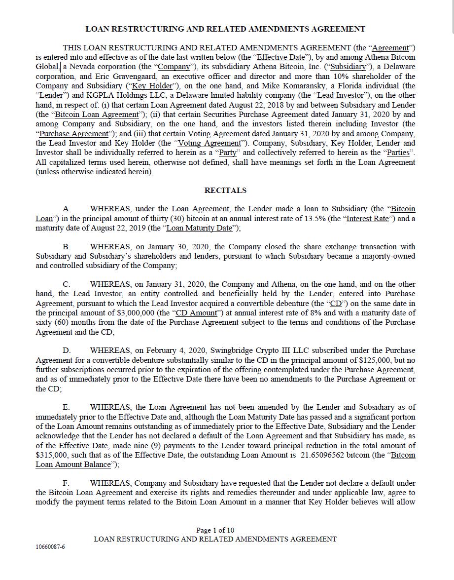 LOAN RESTRUCTURING AND RELATED AMENDMENTS AGREEMENT THIS LOAN RESTRUCTURING AND RELATED AMENDMENTS AGREEMENT (the “ Agreement ”) is entered into and effective as of the date last written below (the “ Effective Date ”), by and among Athena Bitcoin Global, a Nevada corporation (the “ Company ”), its subsdidiary Athena Bitcoin, Inc . (“ Subsidiary ”), a Delaware corporation, and Eric Gravengaard, an executive officer and director and more than 10 % shareholder of the Company and Subsidiary (“ Key Holder ”), on the one hand, and Mike Komaransky, a Florida individual (the “ Lender ”) and KGPLA Holdings LLC, a Delaware limited liability company (the “ Lead Investor ”), on the other hand, in respect of : (i) that certain Loan Agreement dated August 22 , 2018 by and between Subsidiary and Lender (the “ Bitcoin Loan Agreement ”) ; (ii) that certain Securities Purchase Agreement dated January 31 , 2020 by and among Company and Subsidiary, on the one hand, and the investors listed therein including Investor (the “ Purchase Agreement ”) ; and (iii) that certain Voting Agreement dated January 31 , 2020 by and among Company, the Lead Investor and Key Holder (the “ Voting Agreement ”) . Company, Subsidiary, Key Holder, Lender and Investor shall be individually referred to herein as a “ Party ” and collectively referred to herein as the “ Parties ” . All capitalized terms used herein, otherwise not defined, shall have meanings set forth in the Loan Agreement (unless otherwise indicated herein) . RECITALS A. WHEREAS, under the Loan Agreement, the Lender made a loan to Subsidiary (the “ Bitcoin Loan ”) in the principal amount of thirty ( 30 ) bitcoin at an annual interest rate of 13 . 5 % (the “ Interest Rate ”) and a maturity date of August 22 , 2019 (the “ Loan Maturity Date ”) ; B. WHEREAS, on January 30 , 2020 , the Company closed the share exchange transaction with Subsidiary and Subsidiary’s shareholders and lenders, pursuant to which Subsidiary became a majority - owned and controlled subsidiary of the Company ; C. WHEREAS, on January 31 , 2020 , the Company and Athena, on the one hand, and on the other hand, the Lead Investor, an entity controlled and beneficially held by the Lender, entered into Purchase Agreement, pursuant to which the Lead Investor acquired a convertible debenture (the “ CD ”) on the same date in the principal amount of $ 3 , 000 , 000 (the “ CD Amount ”) at annual interest rate of 8 % and with a maturity date of sixty ( 60 ) months from the date of the Purchase Agreement subject to the terms and conditions of the Purchase Agreement and the CD ; D. WHEREAS, on February 4 , 2020 , Swingbridge Crypto III LLC subscribed under the Purchase Agreement for a convertible debenture substantially similar to the CD in the principal amount of $ 125 , 000 , but no further subscriptions occurred prior to the expiration of the offering contemplated under the Purchase Agreement, and as of immediately prior to the Effective Date there have been no amendments to the Purchase Agreement or the CD ; E. WHEREAS, the Loan Agreement has not been amended by the Lender and Subsidiary as of immediately prior to the Effective Date and, although the Loan Maturity Date has passed and a significant portion of the Loan Amount remains outstanding as of immediately prior to the Effective Date, Subsidiary and the Lender acknowledge that the Lender has not declared a default of the Loan Agreement and that Subsidiary has made, as of the Effective Date, made nine ( 9 ) payments to the Lender toward principal reduction in the total amount of $ 315 , 000 , such that as of the Effective Date, the outstanding Loan Amount is 21 . 65096562 bitcoin (the “ Bitcoin Loan Amount Balance ”) ; F. WHEREAS, Company and Subsidiary have requested that the Lender not declare a default under the Bitcoin Loan Agreement and exercise its rights and remedies thereunder and under applicable law, agree to modify the payment terms related to the Bitoin Loan Amount in a manner that Key Holder believes will allow Page 1 of 10 LOAN RESTRUCTURING AND RELATED AMENDMENTS AGREEMENT 10660087 - 6