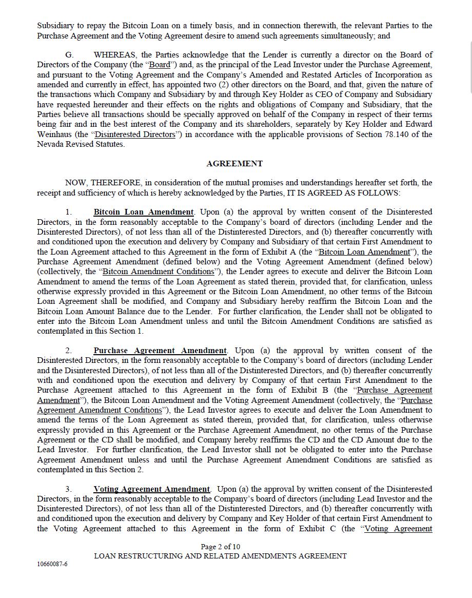 Subsidiary to repay the Bitcoin Loan on a timely basis, and in connection therewith, the relevant Parties to the Purchase Agreement and the Voting Agreement desire to amend such agreements simultaneously; and G. WHEREAS, the Parties acknowledge that the Lender is currently a director on the Board of Directors of the Company (the “ Board ”) and, as the principal of the Lead Investor under the Purchase Agreement, and pursuant to the Voting Agreement and the Company’s Amended and Restated Articles of Incorporation as amended and currently in effect, has appointed two ( 2 ) other directors on the Board, and that, given the nature of the transactions which Company and Subsidiary by and through Key Holder as CEO of Company and Subsidiary have requested hereunder and their effects on the rights and obligations of Company and Subsidiary, that the Parties believe all transactions should be specially approved on behalf of the Company in respect of their terms being fair and in the best interest of the Company and its shareholders, separately by Key Holder and Edward Weinhaus (the “ Disinterested Directors ”) in accordance with the applicable provisions of Section 78 . 140 of the Nevada Revised Statutes . AGREEMENT NOW, THEREFORE, in consideration of the mutual promises and understandings hereafter set forth, the receipt and sufficiency of which is hereby acknowledged by the Parties, IT IS AGREED AS FOLLOWS: 1. Bitcoin Loan Amendment . Upon (a) the approval by written consent of the Disinterested Directors, in the form reasonably acceptable to the Company’s board of directors (including Lender and the Disinterested Directors), of not less than all of the Distinterested Directors, and (b) thereafter concurrently with and conditioned upon the execution and delivery by Company and Subsidiary of that certain First Amendment to the Loan Agreement attached to this Agreement in the form of Exhibit A (the “ Bitcoin Loan Amendment ”), the Purchase Agreement Amendment (defined below) and the Voting Agreement Amendment (defined below) (collectively, the “ Bitcoin Amendment Conditions ”), the Lender agrees to execute and deliver the Bitcoin Loan Amendment to amend the terms of the Loan Agreement as stated therein, provided that, for clarification, unless otherwise expressly provided in this Agreement or the Bitcoin Loan Amendment, no other terms of the Bitcoin Loan Agreement shall be modified, and Company and Subsidiary hereby reaffirm the Bitcoin Loan and the Bitcoin Loan Amount Balance due to the Lender . For further clarification, the Lender shall not be obligated to enter into the Bitcoin Loan Amendment unless and until the Bitcoin Amendment Conditions are satisfied as contemplated in this Section 1 . 2. Purchase Agreement Amendment . Upon (a) the approval by written consent of the Disinterested Directors, in the form reasonably acceptable to the Company’s board of directors (including Lender and the Disinterested Directors), of not less than all of the Distinterested Directors, and (b) thereafter concurrently with and conditioned upon the execution and delivery by Company of that certain First Amendment to the Purchase Agreement attached to this Agreement in the form of Exhibit B (the “ Purchase Agreement Amendment ”), the Bitcoin Loan Amendment and the Voting Agreement Amendment (collectively, the “ Purchase Agreement Amendment Conditions ”), the Lead Investor agrees to execute and deliver the Loan Amendment to amend the terms of the Loan Agreement as stated therein, provided that, for clarification, unless otherwise expressly provided in this Agreement or the Purchase Agreement Amendment, no other terms of the Purchase Agreement or the CD shall be modified, and Company hereby reaffirms the CD and the CD Amount due to the Lead Investor . For further clarification, the Lead Investor shall not be obligated to enter into the Purchase Agreement Amendment unless and until the Purchase Agreement Amendment Conditions are satisfied as contemplated in this Section 2 . 3. Voting Agreement Amendment . Upon (a) the approval by written consent of the Disinterested Directors, in the form reasonably acceptable to the Company’s board of directors (including Lead Investor and the Disinterested Directors), of not less than all of the Distinterested Directors, and (b) thereafter concurrently with and conditioned upon the execution and delivery by Company and Key Holder of that certain First Amendment to the Voting Agreement attached to this Agreement in the form of Exhibit C (the “ Voting Agreement Page 2 of 10 LOAN RESTRUCTURING AND RELATED AMENDMENTS AGREEMENT 10660087 - 6