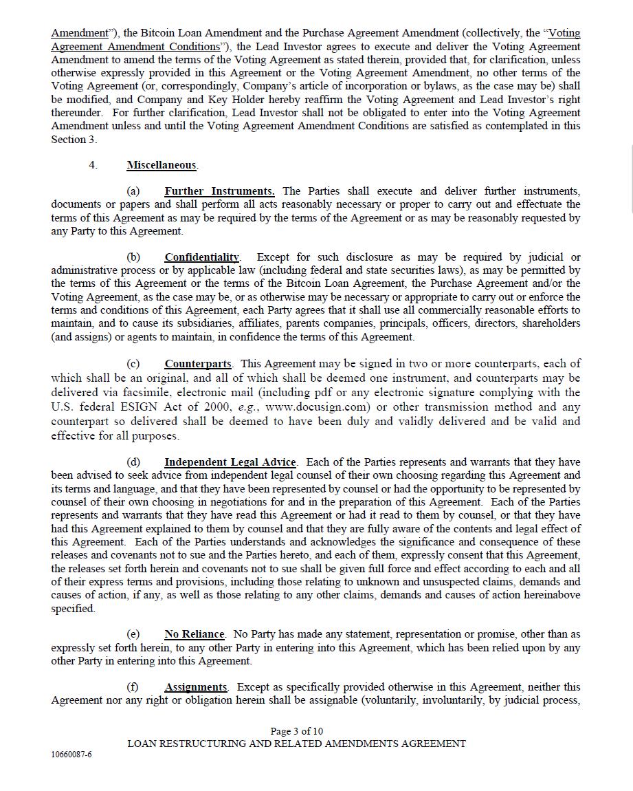 Page 3 of 10 LOAN RESTRUCTURING AND RELATED AMENDMENTS AGREEMENT 10660087 - 6 Amendment ”), the Bitcoin Loan Amendment and the Purchase Agreement Amendment (collectively, the “ Voting Agreement Amendment Conditions ”), the Lead Investor agrees to execute and deliver the Voting Agreement Amendment to amend the terms of the Voting Agreement as stated therein, provided that, for clarification, unless otherwise expressly provided in this Agreement or the Voting Agreement Amendment, no other terms of the Voting Agreement (or, correspondingly, Company’s article of incorporation or bylaws, as the case may be) shall be modified, and Company and Key Holder hereby reaffirm the Voting Agreement and Lead Investor’s right thereunder . For further clarification, Lead Investor shall not be obligated to enter into the Voting Agreement Amendment unless and until the Voting Agreement Amendment Conditions are satisfied as contemplated in this Section 3 . 4. Miscellaneous . (a) Further Instruments . The Parties shall execute and deliver further instruments, documents or papers and shall perform all acts reasonably necessary or proper to carry out and effectuate the terms of this Agreement as may be required by the terms of the Agreement or as may be reasonably requested by any Party to this Agreement . (b) Confidentiality . Except for such disclosure as may be required by judicial or administrative process or by applicable law (including federal and state securities laws), as may be permitted by the terms of this Agreement or the terms of the Bitcoin Loan Agreement, the Purchase Agreement and/or the Voting Agreement, as the case may be, or as otherwise may be necessary or appropriate to carry out or enforce the terms and conditions of this Agreement, each Party agrees that it shall use all commercially reasonable efforts to maintain, and to cause its subsidiaries, affiliates, parents companies, principals, officers, directors, shareholders (and assigns) or agents to maintain, in confidence the terms of this Agreement . (c) Counterparts . This Agreement may be signed in two or more counterparts, each of which shall be an original, and all of which shall be deemed one instrument, and counterparts may be delivered via facsimile, electronic mail (including pdf or any electronic signature complying with the U . S . federal ESIGN Act of 2000 , e . g . , www . docusign . com) or other transmission method and any counterpart so delivered shall be deemed to have been duly and validly delivered and be valid and effective for all purposes . (d) Independent Legal Advice . Each of the Parties represents and warrants that they have been advised to seek advice from independent legal counsel of their own choosing regarding this Agreement and its terms and language, and that they have been represented by counsel or had the opportunity to be represented by counsel of their own choosing in negotiations for and in the preparation of this Agreement . Each of the Parties represents and warrants that they have read this Agreement or had it read to them by counsel, or that they have had this Agreement explained to them by counsel and that they are fully aware of the contents and legal effect of this Agreement . Each of the Parties understands and acknowledges the significance and consequence of these releases and covenants not to sue and the Parties hereto, and each of them, expressly consent that this Agreement, the releases set forth herein and covenants not to sue shall be given full force and effect according to each and all of their express terms and provisions, including those relating to unknown and unsuspected claims, demands and causes of action, if any, as well as those relating to any other claims, demands and causes of action hereinabove specified . (e) No Reliance . No Party has made any statement, representation or promise, other than as expressly set forth herein, to any other Party in entering into this Agreement, which has been relied upon by any other Party in entering into this Agreement . (f) Assignments . Except as specifically provided otherwise in this Agreement, neither this Agreement nor any right or obligation herein shall be assignable (voluntarily, involuntarily, by judicial process,