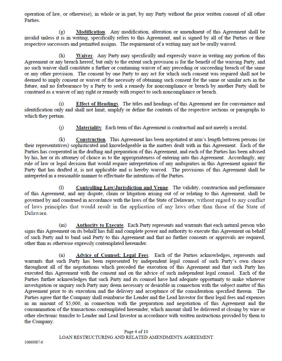 Page 4 of 10 LOAN RESTRUCTURING AND RELATED AMENDMENTS AGREEMENT 10660087 - 6 operation of law, or otherwise), in whole or in part, by any Party without the prior written consent of all other Parties. (g) Modification . Any modification, alteration or amendment of this Agreement shall be invalid unless it is in writing, specifically refers to this Agreement, and is signed by all of the Parties or their respective successors and permitted assigns . The requirement of a writing may not be orally waived . (h) Waiver . Any Party may specifically and expressly waive in writing any portion of this Agreement or any breach hereof, but only to the extent such provision is for the benefit of the waiving Party, and no such waiver shall constitute a further or continuing waiver of any preceding or succeeding breach of the same or any other provision . The consent by one Party to any act for which such consent was required shall not be deemed to imply consent or waiver of the necessity of obtaining such consent for the same or similar acts in the future, and no forbearance by a Party to seek a remedy for noncompliance or breach by another Party shall be construed as a waiver of any right or remedy with respect to such noncompliance or breach . (i) Effect of Headings . The titles and headings of this Agreement are for convenience and identification only and shall not limit, amplify or define the contents of the respective sections or paragraphs to which they pertain . (j) Materiality . Each term of this Agreement is contractual and not merely a recital. (k) Construction . This Agreement has been negotiated at arm’s length between persons (or their representatives) sophisticated and knowledgeable in the matters dealt with in this Agreement . Each of the Parties has cooperated in the drafting and preparation of this Agreement, and each of the Parties has been advised by his, her or its attorney of choice as to the appropriateness of entering into this Agreement . Accordingly, any rule of law or legal decision that would require interpretation of any ambiguities in this Agreement against the Party that has drafted it, is not applicable and is hereby waived . The provisions of this Agreement shall be interpreted in a reasonable manner to effectuate the intentions of the Parties . (l) Controlling Law/Jurisdiction and Venue . The validity, construction and performance of this Agreement, and any dispute, claim or litigation arising out of or relating to this Agreement, shall be governed by and construed in accordance with the laws of the State of Delaware, without regard to any conflict of laws principles that would result in the application of any laws other than those of the State of Delaware . (m) Authority to Execute . Each Party represents and warrants that each natural person who signs this Agreement on its behalf has full and complete power and authority to execute this Agreement on behalf of such Party and to bind said Party to this Agreement and that no further consents or approvals are required, other than as otherwise expressly contemplated hereunder . (n) Advice of Counsel ; Legal Fees . Each of the Parties acknowledges, represents and warrants that such Party has been represented by independent legal counsel of such Party’s own choice throughout all of the negotiations which preceded the execution of this Agreement and that such Party has executed this Agreement with the consent and on the advice of such independent legal counsel . Each of the Parties further acknowledges that such Party and its counsel have had adequate opportunity to make whatever investigation or inquiry such Party may deem necessary or desirable in connection with the subject matter of this Agreement prior to its execution and the delivery and acceptance of the consideration specified therein . The Parties agree that the Company shall reimburse the Lender and the Lead Investor for their legal fees and expenses in an amount of $ 5 , 000 , in connection with the preparation and negotiation of this Agreement and the consummation of the transactions contemplated hereunder, which amount shall be delivered at closing by wire or other electronic transfer to Lender and Lead Investor in accordance with written instructions provided by them to the Company .