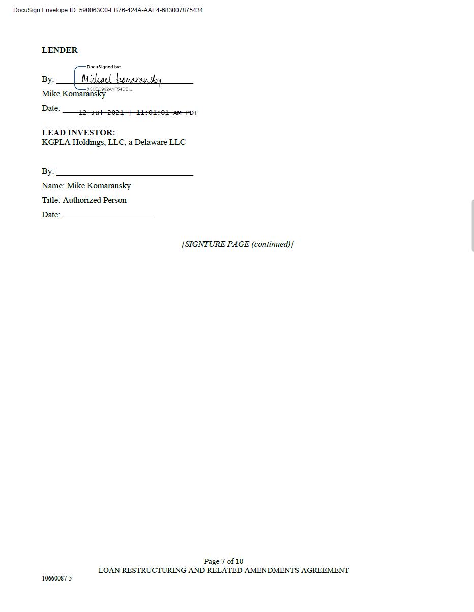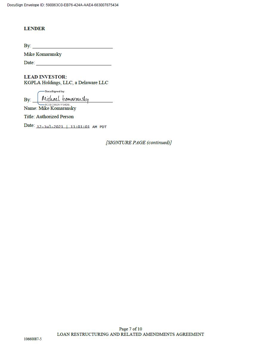 LENDER By: Mike Komaransky Date: LEAD INVESTOR: KGPLA Holdings, LLC, a Delaware LLC By: Name: Mike Komaransky Title: Authorized Person Date: [SIGNTURE PAGE (continued)] DocuSign Envelope ID: 590063C0 - EB76 - 424A - AAE4 - 683007875434 12 - Jul - 2021 | 11:01:01 AM PDT Page 7 of 10 LOAN RESTRUCTURING AND RELATED AMENDMENTS AGREEMENT 10660087 - 5