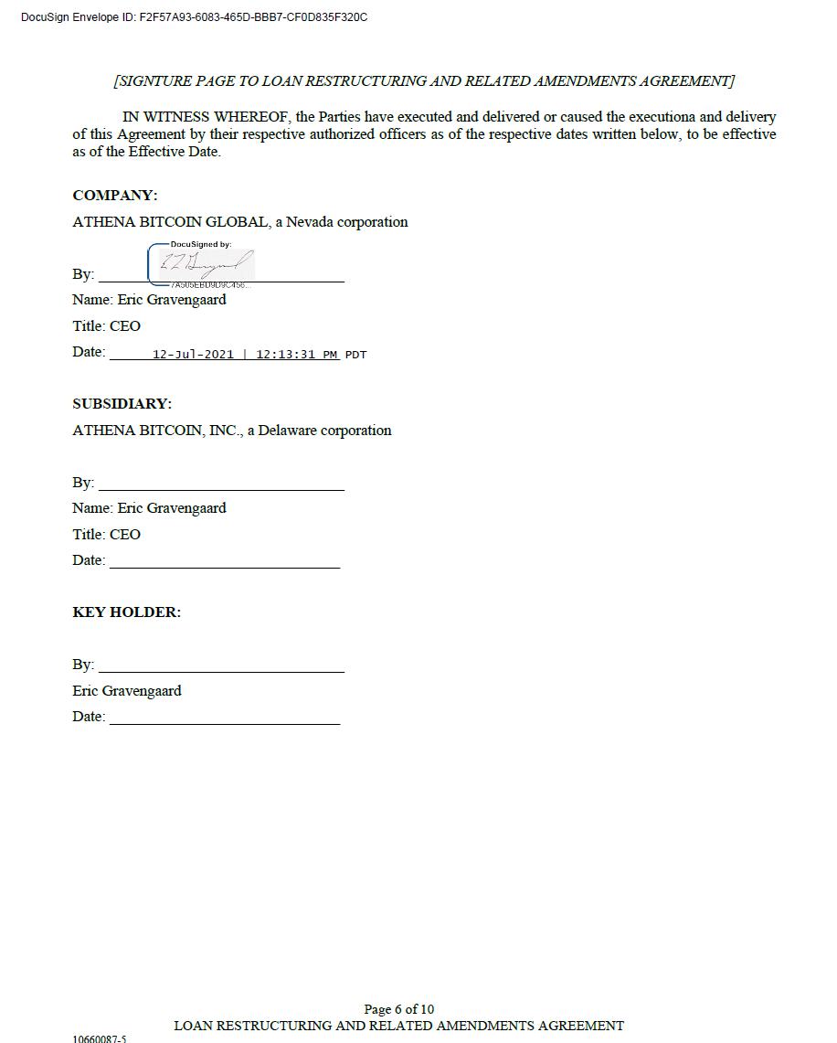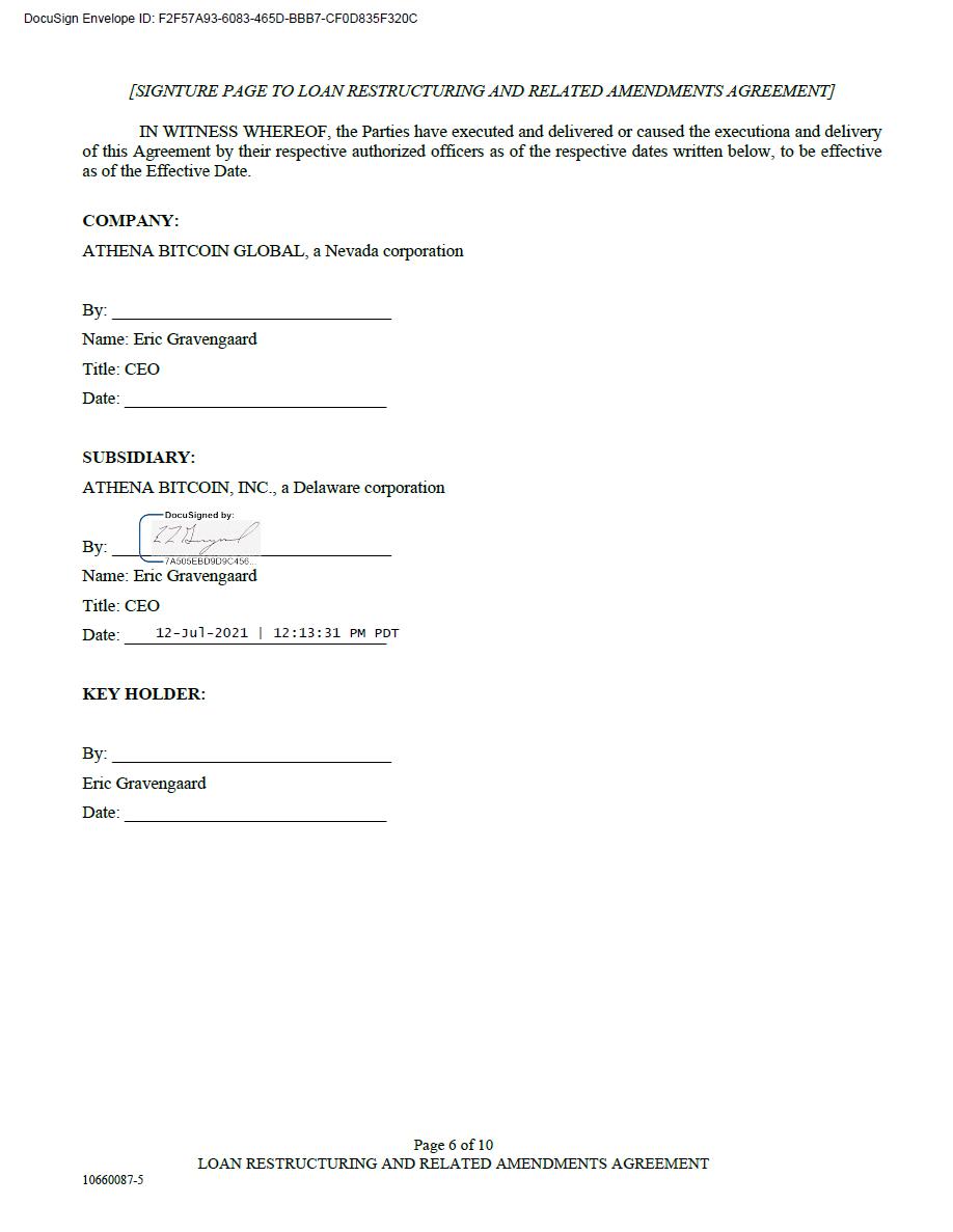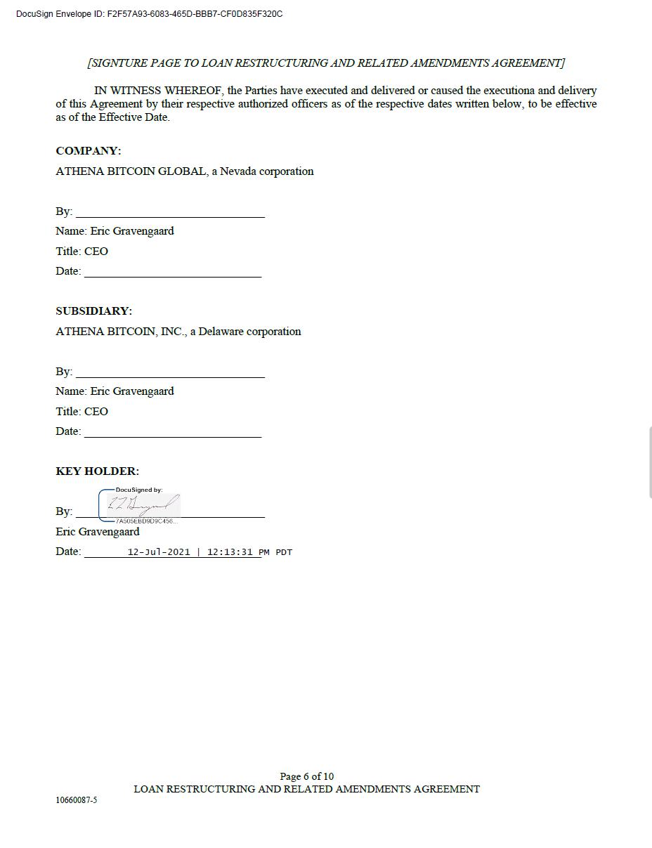 DocuSign Envelope ID: F2F57A93 - 6083 - 465D - BBB7 - CF0D835F320C [SIGNTURE PAGE TO LOAN RESTRUCTURING AND RELATED AMENDMENTS AGREEMENT] IN WITNESS WHEREOF, the Parties have executed and delivered or caused the executiona and delivery of this Agreement by their respective authorized officers as of the respective dates written below, to be effective as of the Effective Date . COMPANY: ATHENA BITCOIN GLOBAL, a Nevada corporation By: Name: Eric Gravengaard Title: CEO Date: 12 - Jul - 2021 | 12:13:31 PM PDT SUBSIDIARY: ATHENA BITCOIN, INC., a Delaware corporation By: Name: Eric Gravengaard Title: CEO Date: KEY HOLDER: By: Eric Gravengaard Date: Page 6 of 10 LOAN RESTRUCTURING AND RELATED AMENDMENTS AGREEMENT 10660087 - 5