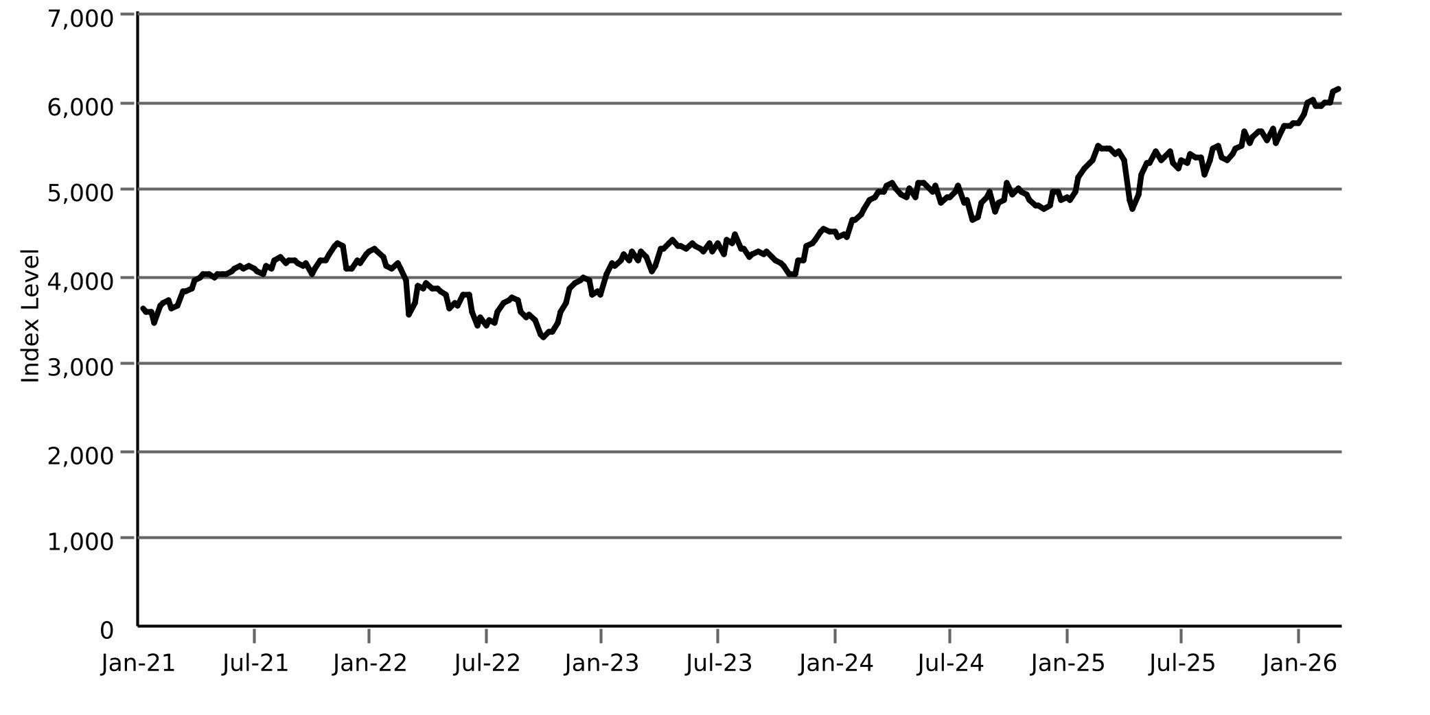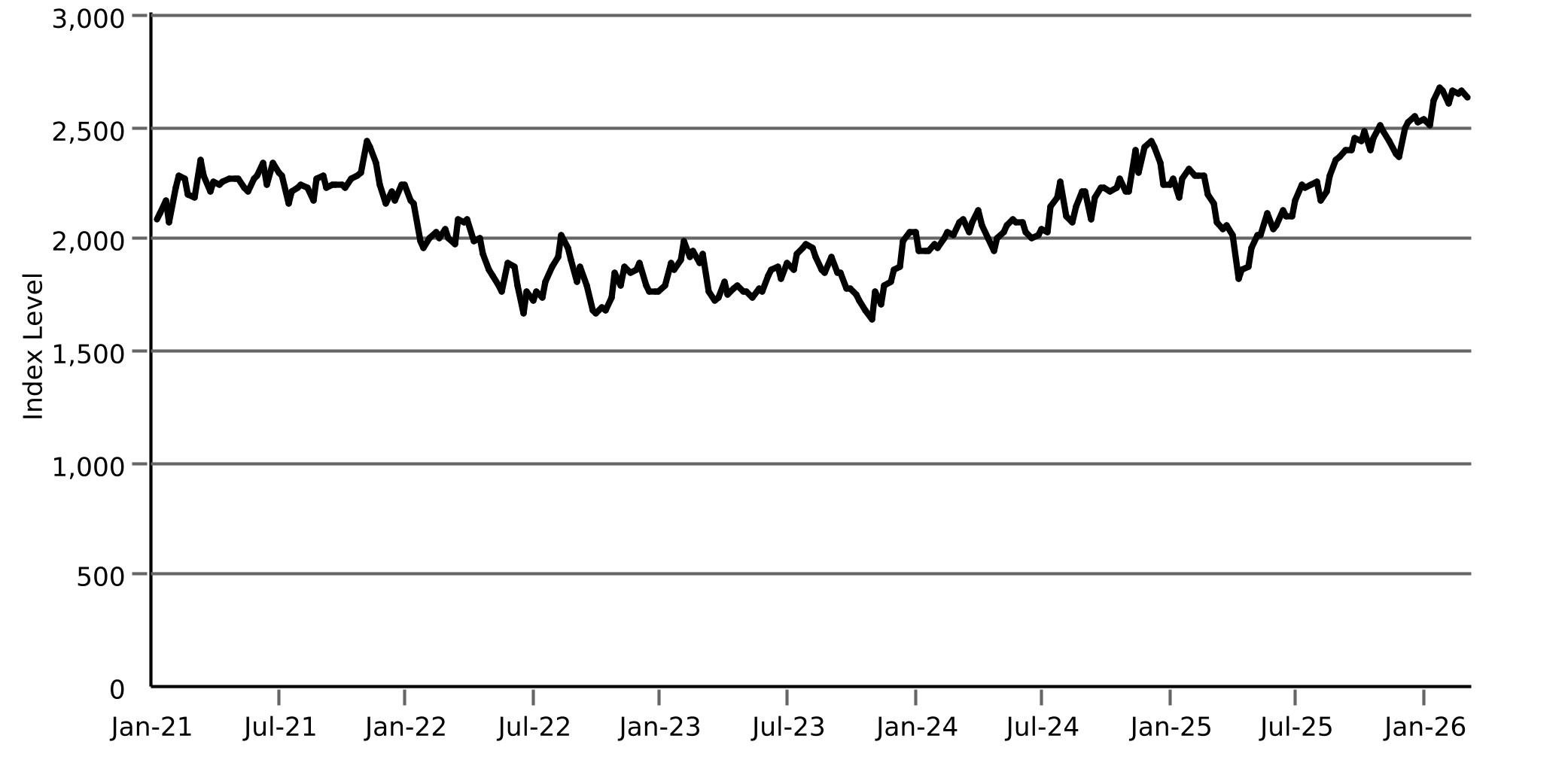 The following graphs set forth the historical performance of each Index based on the weekly historical closing levels from January 8, 2021 through February 27, 2026. The closing level of the Nasdaq-100 Index® on March 5, 2026 was 25,020.41. The closing level of the Russell 2000® Index on March 5, 2026 was 2,585.573. The closing level of the EURO STOXX 50® Index on March 5, 2026 was 5,782.89. We obtained the closing levels above and below from the Bloomberg Professional® service (“Bloomberg”), without independent verification.