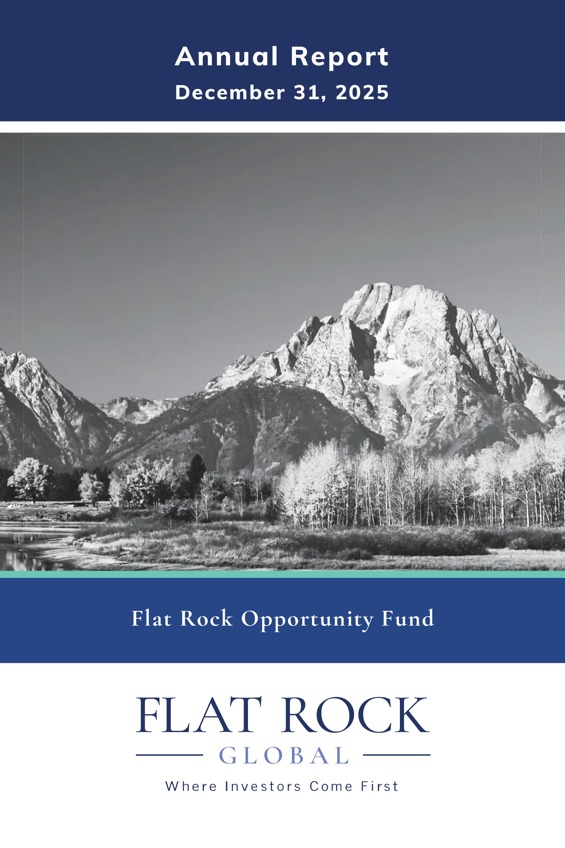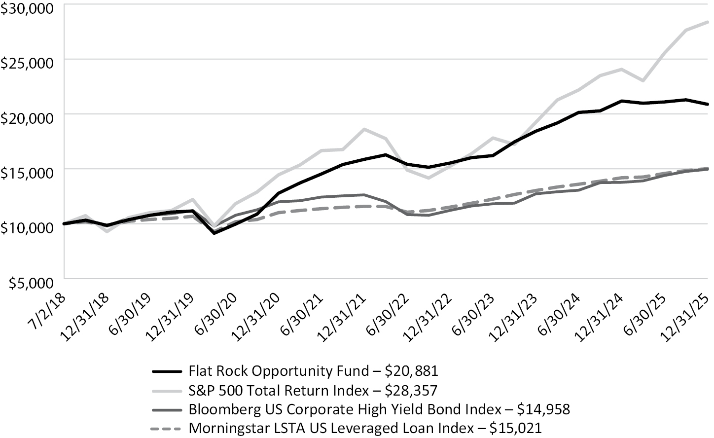 During 2025, Flat Rock Opportunity Fund (“FROPX” or the “Fund”) returned -1.39%, trailing the Standard & Poor’s (“S&P”) 500 Index return of 17.88%. Our result compared favorably to the broader collateralized loan obligation (“CLO”) equity asset class, which Bank of America Research estimates declined by approximately 5% during the year. The standard deviation of the Fund continued to be less than one-third of the S&P 500 Index.