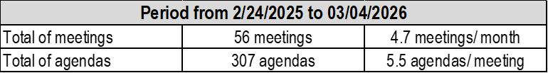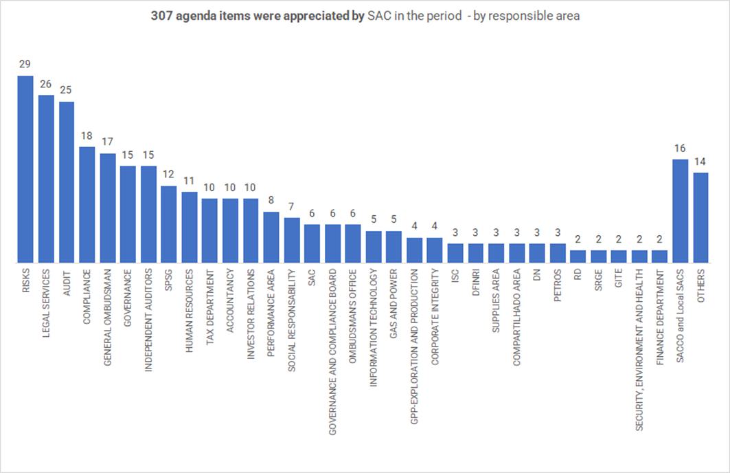 In the period from February 24, 2025 (after the ordinary meeting of SAC that analyzed Petrobras' Financial Statements for the fiscal year ended on 12/31/2024) to March 04, 2026 (date of the ordinary meeting that analyzed the Petrobras' Financial Statements for the year ended 12/31/2025), Petrobras' Statutory Audit Committee held 56 meetings that covered 307 agendas, involving Board Members, Fiscal Council Members, Executive Directors, Executive Managers, General Attorney, General Ombudsman, General Inspector, Internal Auditors, Independent Auditors, Internal and External Lawyers and members of Audit Committees of Petrobras Equity Interests, segregated as follows: