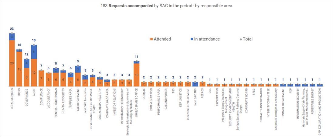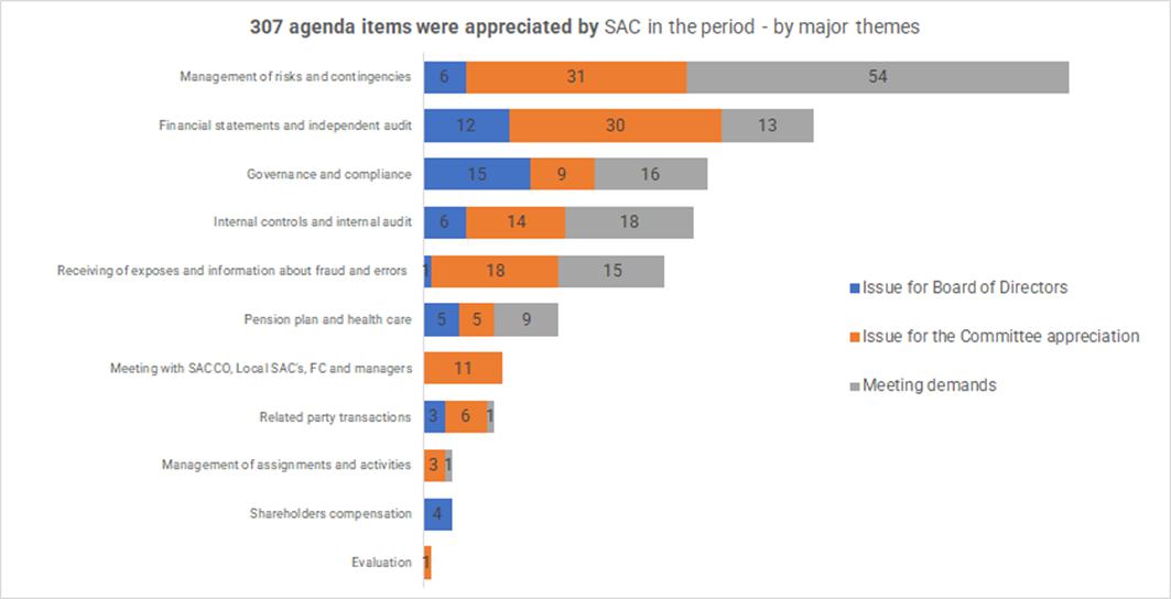 • Holding 2 joint meetings with the Fiscal Council, and holding 12 meetings, as agenda items, with the Petrobras Conglomerate Audit Committee (SACCO) and with the audit committees of the Petrobras conglomerate companies that have their own SAC (Local SAC), namely: Transpetro SAC and TBG SAC, with the objective of supervising the work developed by these committees.