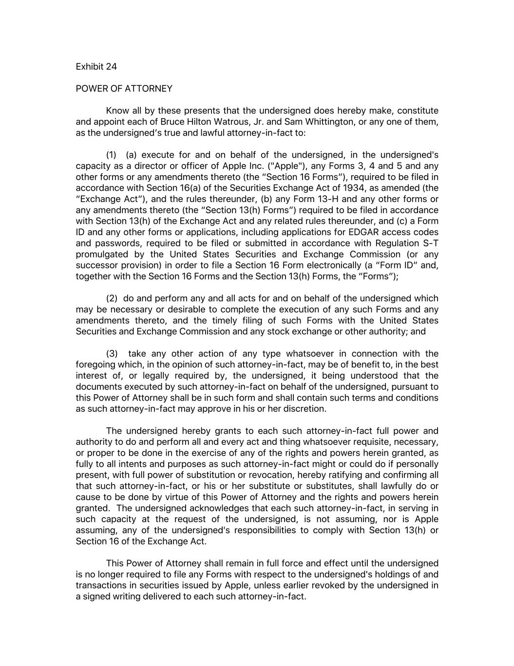 Exhibit 24 POWER OF ATTORNEY Know all by these presents that the undersigned does hereby make, constitute and appoint each of Bruce Hilton Watrous, Jr. and Sam Whittington, or any one of them, as the undersigned’s true and lawful attorney-in-fact to: (1) (a) execute for and on behalf of the undersigned, in the undersigned's capacity as a director or officer of Apple Inc. ("Apple"), any Forms 3, 4 and 5 and any other forms or any amendments thereto (the “Section 16 Forms”), required to be filed in accordance with Section 16(a) of the Securities Exchange Act of 1934, as amended (the “Exchange Act”), and the rules thereunder, (b) any Form 13-H and any other forms or any amendments thereto (the “Section 13(h) Forms”) required to be filed in accordance with Section 13(h) of the Exchange Act and any related rules thereunder, and (c) a Form ID and any other forms or applications, including applications for EDGAR access codes and passwords, required to be filed or submitted in accordance with Regulation S-T promulgated by the United States Securities and Exchange Commission (or any successor provision) in order to file a Section 16 Form electronically (a “Form ID” and, together with the Section 16 Forms and the Section 13(h) Forms, the “Forms”); (2) do and perform any and all acts for and on behalf of the undersigned which may be necessary or desirable to complete the execution of any such Forms and any amendments thereto, and the timely filing of such Forms with the United States Securities and Exchange Commission and any stock exchange or other authority; and (3) take any other action of any type whatsoever in connection with the foregoing which, in the opinion of such attorney-in-fact, may be of benefit to, in the best interest of, or legally required by, the undersigned, it being understood that the documents executed by such attorney-in-fact on behalf of the undersigned, pursuant to this Power of Attorney shall be in such form and shall contain such terms and conditions as such attorney-in-fact may approve in his or her discretion. The undersigned hereby grants to each such attorney-in-fact full power and authority to do and perform all and every act and thing whatsoever requisite, necessary, or proper to be done in the exercise of any of the rights and powers herein granted, as fully to all intents and purposes as such attorney-in-fact might or could do if personally present, with full power of substitution or revocation, hereby ratifying and confirming all that such attorney-in-fact, or his or her substitute or substitutes, shall lawfully do or cause to be done by virtue of this Power of Attorney and the rights and powers herein granted. The undersigned acknowledges that each such attorney-in-fact, in serving in such capacity at the request of the undersigned, is not assuming, nor is Apple assuming, any of the undersigned's responsibilities to comply with Section 13(h) or Section 16 of the Exchange Act. This Power of Attorney shall remain in full force and effect until the undersigned is no longer required to file any Forms with respect to the undersigned's holdings of and transactions in securities issued by Apple, unless earlier revoked by the undersigned in a signed writing delivered to each such attorney-in-fact.