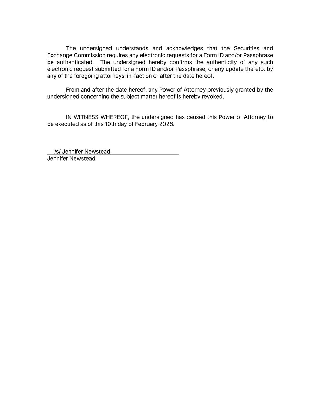 The undersigned understands and acknowledges that the Securities and Exchange Commission requires any electronic requests for a Form ID and/or Passphrase be authenticated. The undersigned hereby confirms the authenticity of any such electronic request submitted for a Form ID and/or Passphrase, or any update thereto, by any of the foregoing attorneys-in-fact on or after the date hereof. From and after the date hereof, any Power of Attorney previously granted by the undersigned concerning the subject matter hereof is hereby revoked. IN WITNESS WHEREOF, the undersigned has caused this Power of Attorney to be executed as of this 10th day of February 2026. /s/ Jennifer Newstead Jennifer Newstead