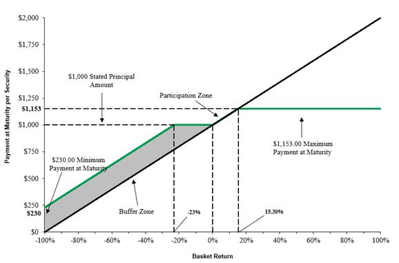 You will receive at maturity for each security you then hold: § If the final basket value is greater than the initial basket value: $1,000 + the return amount, subject to the maximum return at maturity § If the final basket value is less than or equal to the initial basket value but greater than or equal to the final buffer value: $1,000 § If the final basket value is less than the final buffer value: $1,000 + [$1,000 × (the basket return + the buffer percentage)] If the final basket value is less than the final buffer value, which means that the basket has depreciated from the initial basket value by more than the buffer percentage, you will lose 1% of the stated principal amount of your securities at maturity for every 1% by which that depreciation exceeds the buffer percentage. | ||