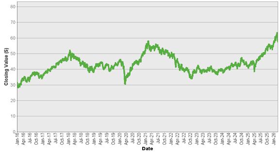 | iShares® MSCI Emerging Markets ETF – Historical Closing Values January 4, 2016 to March 5, 2026 |