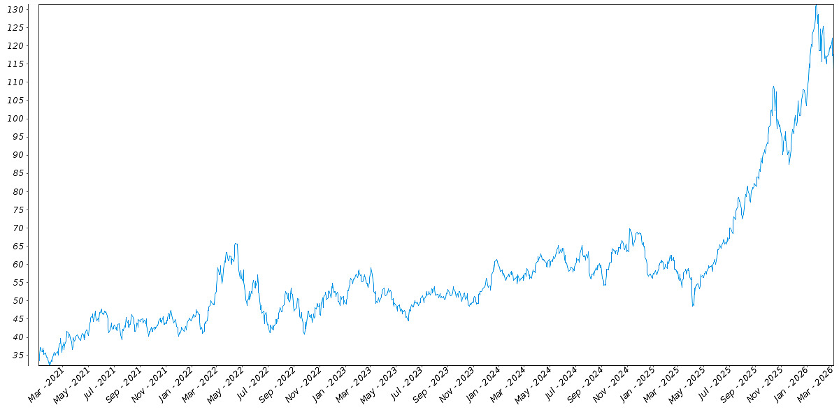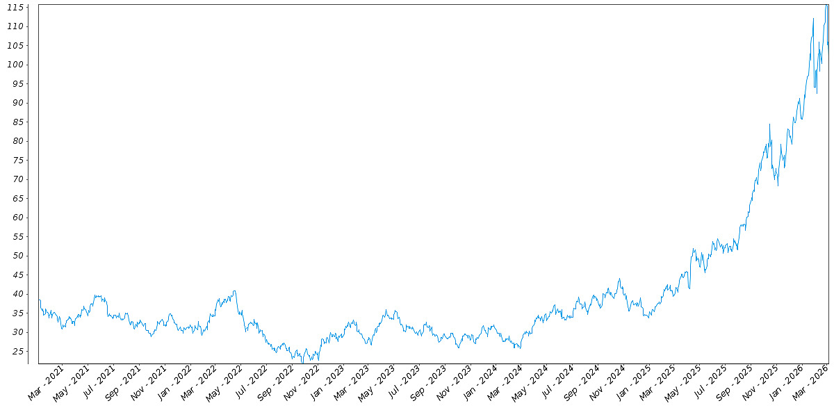 The following graph sets forth the daily historical performance of the GDX in the period from January 2, 2021 through the pricing date. We obtained this historical data from Bloomberg L.P. We have not independently verified the accuracy or completeness of the information obtained from Bloomberg L.P. The GDX began tracking the MarketVector Global Gold Miners Index after the close of trading on September 19, 2025. Prior to September 19, 2025, the GDX tracked the NYSE® Arca Gold Miners Index®. Any historical information about the performance of the GDX for any period before the close of trading on September 19, 2025 therefore should not be considered information relevant to how the GDX will perform as it tracks the MarketVector Global Gold Miners Index.On the pricing date, the Closing Market Price of the GDX was $101.82.