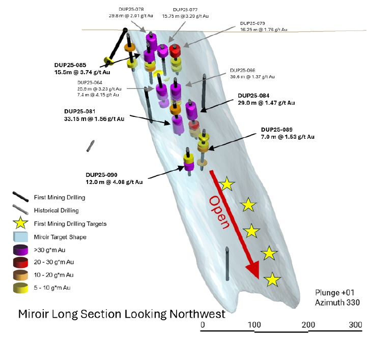 Notable results from the most recent drilling include drill hole DUP25-081 returning 1.56 g/t Au over 33.15 m, including 3.18 g/t Au over 7.60 m. Drillhole DUP25-085 returned 3.74 g/t Au over 15.5 m and 7.18 g/t over 8.0 m, including 30.58 g/t over 1.65 m, and DUP25-090 returned 4.08 g/t Au over 12.0 m, including 11.20 g/t Au over 1.0 m. These results continue to demonstrate the potential for multiple, high-quality gold zones within the Miroir target and reinforce its potential for further growth.