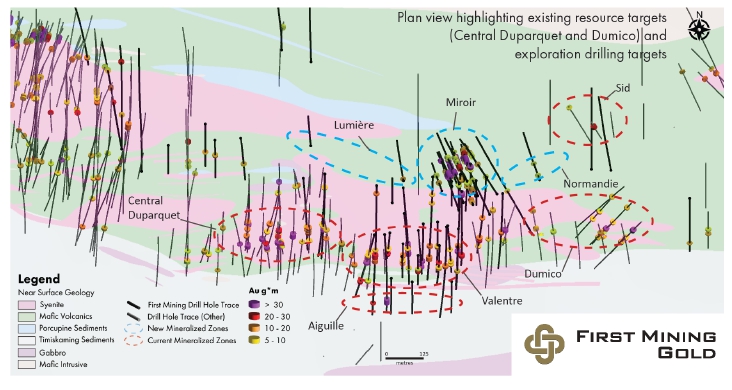 Figure 2: Plan view map, highlighting the Miroir, Valentre and other significant targets in the Central Duparquet-Dumico area (CNW Group/First Mining Gold Corp.)