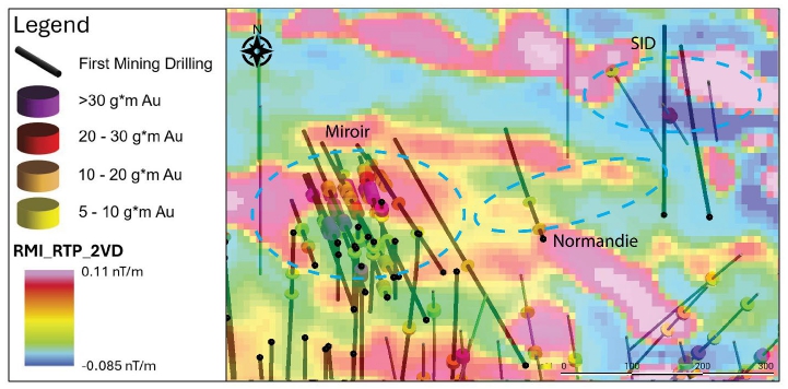 Two additional greenfields exploration targets, Normandie and Lumière, were drill tested in 2025 with a program (Figure 2) targeting geophysical anomalies hosted along favourable lithological contacts. Normandie, a geophysically interpreted structure located 150 m towards the northeast along strike from Miroir, returned 1.39 g/t Au over 4.0 m and 5.22 g/t Au over 1.0 m in DUP25-068, highlighting a favourable area for gold mineralization and further geological modelling and drill testing. Drilling at the Lumière target, located ~300 m northwest of Miroir, returned 7.74 g/t Au over 1.40 m as well as 2.23 g/t Au over 1.50 m near surface in drill hole DUP25-086, successfully demonstrating the presence of favourable mineralization and once further modelled, a favourable target for follow up drilling.