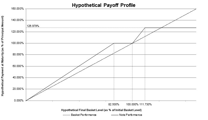 ●if the final basket level is less than the initial basket level by more than 17.50% (the basket return is negative and is less than -17.50%), you will receive an amount in cash equal to the sum of (i) $1,000 plus (ii) the product of (a) $1,000 times (b) the buffer rate of approximately 121.21% times (c) the sum of the basket return plus 17.50%.