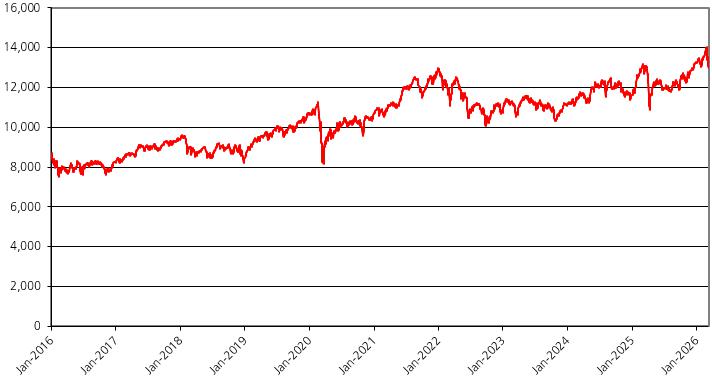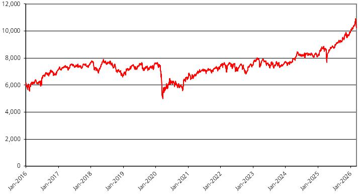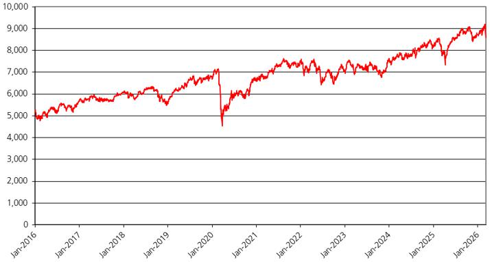The graph below illustrates the performance of the UKX from January 1, 2016 through March 9, 2026. The closing level of the UKX on March 9, 2026 was 10,249.52.