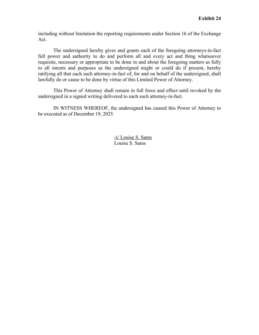 Exhibit 24 including without limitation the reporting requirements under Section 16 of the Exchange Act. The undersigned hereby gives and grants each of the foregoing attorneys-in-fact full power and authority to do and perform all and every act and thing whatsoever requisite, necessary or appropriate to be done in and about the foregoing matters as fully to all intents and purposes as the undersigned might or could do if present, hereby ratifying all that each such attorney-in-fact of, for and on behalf of the undersigned, shall lawfully do or cause to be done by virtue of this Limited Power of Attorney. This Power of Attorney shall remain in full force and effect until revoked by the undersigned in a signed writing delivered to each such attorney-in-fact. IN WITNESS WHEREOF, the undersigned has caused this Power of Attorney to be executed as of December 19, 2025. /s/ Louise S. Sams Louise S. Sams