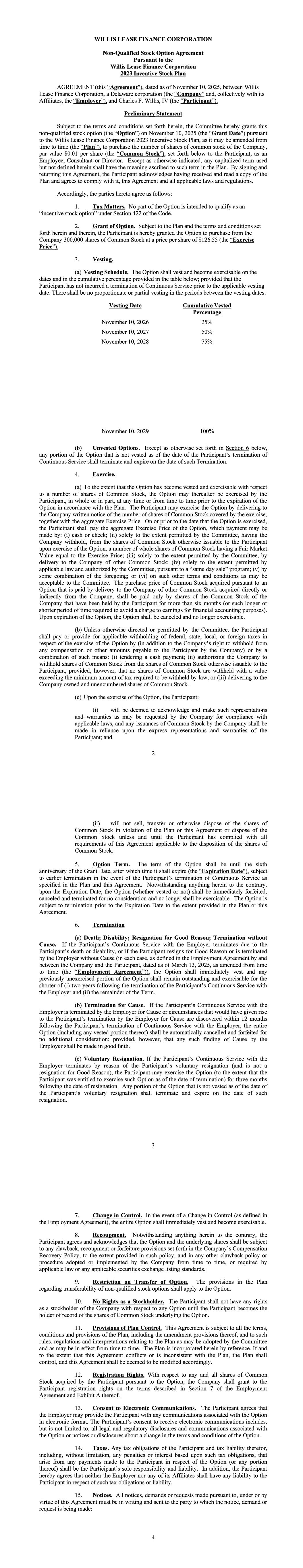 WILLIS LEASE FINANCE CORPORATION Non-Qualified Stock Option Agreement Pursuant to the Willis Lease Finance Corporation 2023 Incentive Stock Plan AGREEMENT (this "Agreement"), dated as of November 10, 2025, between Willis Lease Finance Corporation, a Delaware corporation (the "Company" and, collectively with its Affiliates, the "Employer"), and Charles F. Willis, IV (the "Participant"). Preliminary Statement Subject to the terms and conditions set forth herein, the Committee hereby grants this non-qualified stock option (the "Option") on November 10, 2025 (the "Grant Date") pursuant to the Willis Lease Finance Corporation 2023 Incentive Stock Plan, as it may be amended from time to time (the "Plan"), to purchase the number of shares of common stock of the Company, par value $0.01 per share (the "Common Stock"), set forth below to the Participant, as an Employee, Consultant or Director. Except as otherwise indicated, any capitalized term used but not defined herein shall have the meaning ascribed to such term in the Plan. By signing and returning this Agreement, the Participant acknowledges having received and read a copy of the Plan and agrees to comply with it, this Agreement and all applicable laws and regulations. Accordingly, the parties hereto agree as follows: 1. Tax Matters. No part of the Option is intended to qualify as an "incentive stock option" under Section 422 of the Code. 2. Grant of Option. Subject to the Plan and the terms and conditions set forth herein and therein, the Participant is hereby granted the Option to purchase from the Company 300,000 shares of Common Stock at a price per share of $126.55 (the "Exercise Price"). 3. Vesting. (a) Vesting Schedule. The Option shall vest and become exercisable on the dates and in the cumulative percentage provided in the table below; provided that the Participant has not incurred a termination of Continuous Service prior to the applicable vesting date. There shall be no proportionate or partial vesting in the periods between the vesting dates: Vesting Date November 10, 2026 November 10, 2027 November 10, 2028 Cumulative Vested Percentage 25% 50% 75% November 10, 2029 100% (b) Unvested Options. Except as otherwise set forth in Section 6 below, any portion of the Option that is not vested as of the date of the Participant's termination of Continuous Service shall terminate and expire on the date of such Termination. 4. Exercise. (a) To the extent that the Option has become vested and exercisable with respect to a number of shares of Common Stock, the Option may thereafter be exercised by the Participant, in whole or in part, at any time or from time to time prior to the expiration of the Option in accordance with the Plan. The Participant may exercise the Option by delivering to the Company written notice of the number of shares of Common Stock covered by the exercise, together with the aggregate Exercise Price. On or prior to the date that the Option is exercised, the Participant shall pay the aggregate Exercise Price of the Option, which payment may be made by: (i) cash or check; (ii) solely to the extent permitted by the Committee, having the Company withhold, from the shares of Common Stock otherwise issuable to the Participant upon exercise of the Option, a number of whole shares of Common Stock having a Fair Market Value equal to the Exercise Price; (iii) solely to the extent permitted by the Committee, by delivery to the Company of other Common Stock; (iv) solely to the extent permitted by applicable law and authorized by the Committee, pursuant to a "same day sale" program; (v) by some combination of the foregoing; or (vi) on such other terms and conditions as may be acceptable to the Committee. The purchase price of Common Stock acquired pursuant to an Option that is paid by delivery to the Company of other Common Stock acquired directly or indirectly from the Company, shall be paid only by shares of the Common Stock of the Company that have been held by the Participant for more than six months ( or such longer or shorter period of time required to avoid a charge to earnings for financial accounting purposes). Upon expiration of the Option, the Option shall be canceled and no longer exercisable. (b) Unless otherwise directed or permitted by the Committee, the Participant shall pay or provide for applicable withholding of federal, state, local, or foreign taxes in respect of the exercise of the Option by (in addition to the Company's right to withhold from any compensation or other amounts payable to the Participant by the Company) or by a combination of such means: (i) tendering a cash payment; (ii) authorizing the Company to withhold shares of Common Stock from the shares of Common Stock otherwise issuable to the Participant, provided, however, that no shares of Common Stock are withheld with a value exceeding the minimum amount of tax required to be withheld by law; or (iii) delivering to the Company owned and unencumbered shares of Common Stock. (c) Upon the exercise of the Option, the Participant: (i) will be deemed to acknowledge and make such representations and warranties as may be requested by the Company for compliance with applicable laws, and any issuances of Common Stock by the Company shall be made in reliance upon the express representations and warranties of the Participant; and 2 (ii) will not sell, transfer or otherwise dispose of the shares of Common Stock in violation of the Plan or this Agreement or dispose of the Common Stock unless and until the Participant has complied with all requirements of this Agreement applicable to the disposition of the shares of Common Stock. 5. Option Term. The term of the Option shall be until the sixth anniversary of the Grant Date, after which time it shall expire (the "Expiration Date"), subject to earlier termination in the event of the Participant's termination of Continuous Service as specified in the Plan and this Agreement. Notwithstanding anything herein to the co