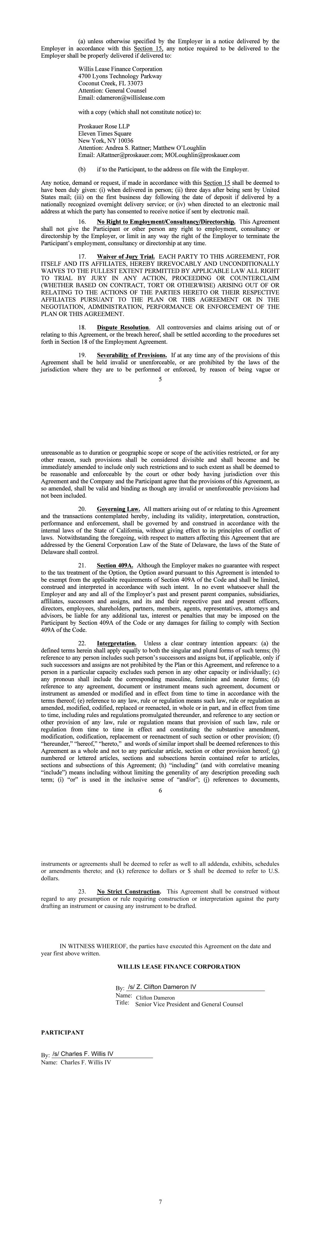 (a) unless otherwise specified by the Employer in a notice delivered by the Employer in accordance with this Section 15, any notice required to be delivered to the Employer shall be properly delivered if delivered to: Willis Lease Finance Corporation 4700 Lyons Technology Parkway Coconut Creek, FL 33073 Attention: General Counsel Email: cdameron@willislease.com with a copy (which shall not constitute notice) to: Proskauer Rose LLP Eleven Times Square New York, NY 10036 Attention: Andrea S. Rattner; Matthew O'Loughlin Email: ARattner@proskauer.com; MOLoughlin@proskauer.com (b) if to the Participant, to the address on file with the Employer. Any notice, demand or request, if made in accordance with this Section 15 shall be deemed to have been duly given: (i) when delivered in person; (ii) three days after being sent by United States mail; (iii) on the first business day following the date of deposit if delivered by a nationally recognized overnight delivery service; or (iv) when directed to an electronic mail address at which the party has consented to receive notice if sent by electronic mail. 16. No Right to Employment/Consultancy/Directorship. This Agreement shall not give the Participant or other person any right to employment, consultancy or directorship by the Employer, or limit in any way the right of the Employer to terminate the Participant's employment, consultancy or directorship at any time. 17. Waiver of Jury Trial. EACH PARTY TO THIS AGREEMENT, FOR ITSELF AND ITS AFFILIATES, HEREBY IRREVOCABLY AND UNCONDITIONALLY WAIVES TO THE FULLEST EXTENT PERMITTED BY APPLICABLE LAW ALL RIGHT TO TRIAL BY JURY IN ANY ACTION, PROCEEDING OR COUNTERCLAIM (WHETHER BASED ON CONTRACT, TORT OR OTHERWISE) ARISING OUT OF OR RELATING TO THE ACTIONS OF THE PARTIES HERETO OR THEIR RESPECTIVE AFFILIATES PURSUANT TO THE PLAN OR THIS AGREEMENT OR IN THE NEGOTIATION, ADMINISTRATION, PERFORMANCE OR ENFORCEMENT OF THE PLAN OR THIS AGREEMENT. 18. Dispute Resolution. All controversies and claims arising out of or relating to this Agreement, or the breach hereof, shall be settled according to the procedures set forth in Section 18 of the Employment Agreement. 19. Severability of Provisions. If at any time any of the provisions of this Agreement shall be held invalid or unenforceable, or are prohibited by the laws of the jurisdiction where they are to be performed or enforced, by reason of being vague or 5 unreasonable as to duration or geographic scope or scope of the activities restricted, or for any other reason, such provisions shall be considered divisible and shall become and be immediately amended to include only such restrictions and to such extent as shall be deemed to be reasonable and enforceable by the court or other body having jurisdiction over this Agreement and the Company and the Participant agree that the provisions of this Agreement, as so amended, shall be valid and binding as though any invalid or unenforceable provisions had not been included. 20. Governing Law. All matters arising out of or relating to this Agreement and the transactions contemplated hereby, including its validity, interpretation, construction, performance and enforcement, shall be governed by and construed in accordance with the internal laws of the State of California, without giving effect to its principles of conflict of laws. Notwithstanding the foregoing, with respect to matters affecting this Agreement that are addressed by the General Corporation Law of the State of Delaware, the laws of the State of Delaware shall control. 21. Section 409A. Although the Employer makes no guarantee with respect to the tax treatment of the Option, the Option award pursuant to this Agreement is intended to be exempt from the applicable requirements of Section 409A of the Code and shall be limited, construed and interpreted in accordance with such intent. In no event whatsoever shall the Employer and any and all of the Employer's past and present parent companies, subsidiaries, affiliates, successors and assigns, and its and their respective past and present officers, directors, employees, shareholders, partners, members, agents, representatives, attorneys and advisors, be liable for any additional tax, interest or penalties that may be imposed on the Participant by Section 409A of the Code or any damages for failing to comply with Section 409A of the Code. 22. Interpretation. Unless a clear contrary intention appears: (a) the defined terms herein shall apply equally to both the singular and plural forms of such terms; (b) reference to any person includes such person's successors and assigns but, if applicable, only if such successors and assigns are not prohibited by the Plan or this Agreement, and reference to a person in a particular capacity excludes such person in any other capacity or individually; ( c) any pronoun shall include the corresponding masculine, feminine and neuter forms; ( d) reference to any agreement, document or instrument means such agreement, document or instrument as amended or modified and in effect from time to time in accordance with the terms thereof; ( e) reference to any law, rule or regulation means such law, rule or regulation as amended, modified, codified, replaced or reenacted, in whole or in part, and in effect from time to time, including rules and regulations promulgated thereunder, and reference to any section or other provision of any law, rule or regulation means that provision of such law, rule or regulation from time to time in effect and constituting the substantive amendment, modification, codification, replacement or reenactment of such section or other provision; (f) "hereunder," "hereof," "hereto," and words of similar import shall be deemed references to this Agreement as a whole and not to any particular article, section or other provision hereof; (g) numbered or lettered articles, sections and subsections herein contained refer to articles, sections and subsections of this Agreement;