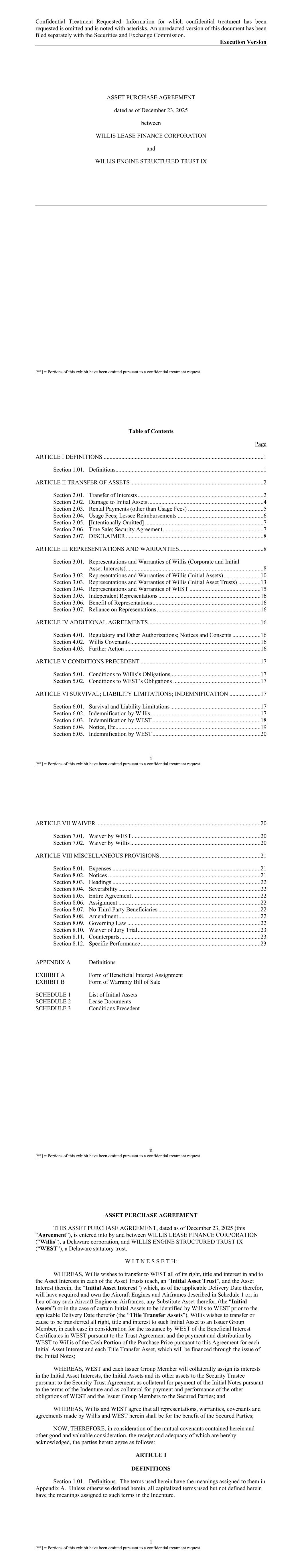 Confidential Treatment Requested: Information for which confidential treatment has been requested is omitted and is noted with asterisks. An unredacted version of this document has been filed separately with the Securities and Exchange Commission. Execution Version [**] = Portions of this exhibit have been omitted pursuant to a confidential treatment request. ASSET PURCHASE AGREEMENT dated as of December 23, 2025 between WILLIS LEASE FINANCE CORPORATION and WILLIS ENGINE STRUCTURED TRUST IX i [**] = Portions of this exhibit have been omitted pursuant to a confidential treatment request. Table of Contents Page ARTICLE I DEFINITIONS ............................................................................................................1 Section 1.01. Definitions....................................................................................................1 ARTICLE II TRANSFER OF ASSETS ..........................................................................................2 Section 2.01. Transfer of Interests .....................................................................................2 Section 2.02. Damage to Initial Assets ..............................................................................4 Section 2.03. Rental Payments (other than Usage Fees) ...................................................5 Section 2.04. Usage Fees; Lessee Reimbursements ..........................................................6 Section 2.05. [Intentionally Omitted] ................................................................................7 Section 2.06. True Sale; Security Agreement ....................................................................7 Section 2.07. DISCLAIMER .............................................................................................8 ARTICLE III REPRESENTATIONS AND WARRANTIES .........................................................8 Section 3.01. Representations and Warranties of Willis (Corporate and Initial Asset Interests) .............................................................................................8 Section 3.02. Representations and Warranties of Willis (Initial Assets) .........................10 Section 3.03. Representations and Warranties of Willis (Initial Asset Trusts) ...............13 Section 3.04. Representations and Warranties of WEST ................................................15 Section 3.05. Independent Representations .....................................................................16 Section 3.06. Benefit of Representations .........................................................................16 Section 3.07. Reliance on Representations ......................................................................16 ARTICLE IV ADDITIONAL AGREEMENTS ............................................................................16 Section 4.01. Regulatory and Other Authorizations; Notices and Consents ...................16 Section 4.02. Willis Covenants ........................................................................................16 Section 4.03. Further Action ............................................................................................16 ARTICLE V CONDITIONS PRECEDENT .................................................................................17 Section 5.01. Conditions to Willis’s Obligations.............................................................17 Section 5.02. Conditions to WEST’s Obligations ...........................................................17 ARTICLE VI SURVIVAL; LIABILITY LIMITATIONS; INDEMNIFICATION .....................17 Section 6.01. Survival and Liability Limitations .............................................................17 Section 6.02. Indemnification by Willis ..........................................................................17 Section 6.03. Indemnification by WEST .........................................................................18 Section 6.04. Notice, Etc..................................................................................................19 Section 6.05. Indemnification by WEST .........................................................................20 ii [**] = Portions of this exhibit have been omitted pursuant to a confidential treatment request. ARTICLE VII WAIVER ...............................................................................................................20 Section 7.01. Waiver by WEST .......................................................................................20 Section 7.02. Waiver by Willis ........................................................................................20 ARTICLE VIII MISCELLANEOUS PROVISIONS ....................................................................21 Section 8.01. Expenses ....................................................................................................21 Section 8.02. Notices .......................................................................................................21 Section 8.03. Headings ....................................................................................................22 Section 8.04. Severability ................................................................................................22 Section 8.05. Entire Agreement .......................................................................................22 Section 8.06. Assignment ................................................................................................22 Section 8.07. No Third Party Beneficiaries .....................................................................22 Section 8.08. Amendment ................................................................................................22 Section 8.09. Governing Law ..........................................................................................22 Section 8.10. Waiver of Jury Trial ..................................................................