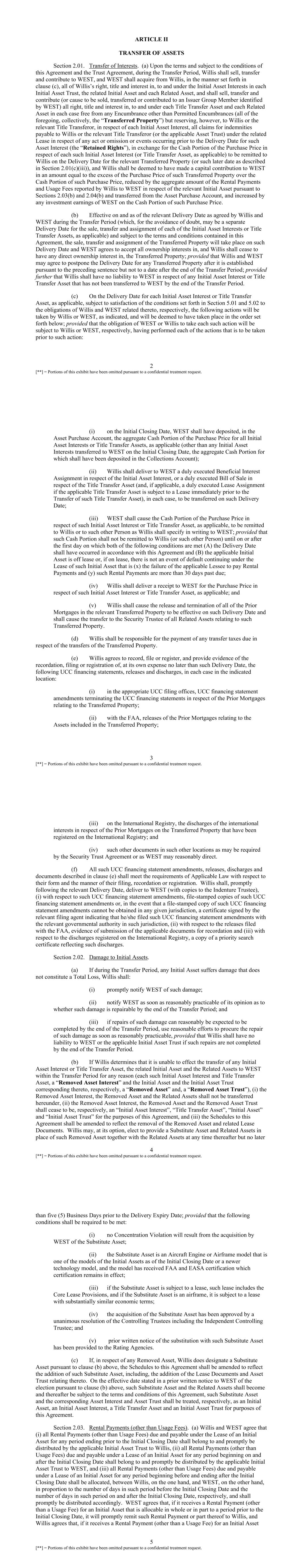 2 [**] = Portions of this exhibit have been omitted pursuant to a confidential treatment request. ARTICLE II TRANSFER OF ASSETS Section 2.01. Transfer of Interests. (a) Upon the terms and subject to the conditions of this Agreement and the Trust Agreement, during the Transfer Period, Willis shall sell, transfer and contribute to WEST, and WEST shall acquire from Willis, in the manner set forth in clause (c), all of Willis’s right, title and interest in, to and under the Initial Asset Interests in each Initial Asset Trust, the related Initial Asset and each Related Asset, and shall sell, transfer and contribute (or cause to be sold, transferred or contributed to an Issuer Group Member identified by WEST) all right, title and interest in, to and under each Title Transfer Asset and each Related Asset in each case free from any Encumbrance other than Permitted Encumbrances (all of the foregoing, collectively, the “Transferred Property”) but reserving, however, to Willis or the relevant Title Transferor, in respect of each Initial Asset Interest, all claims for indemnities payable to Willis or the relevant Title Transferor (or the applicable Asset Trust) under the related Lease in respect of any act or omission or events occurring prior to the Delivery Date for such Asset Interest (the “Retained Rights”), in exchange for the Cash Portion of the Purchase Price in respect of each such Initial Asset Interest (or Title Transfer Asset, as applicable) to be remitted to Willis on the Delivery Date for the relevant Transferred Property (or such later date as described in Section 2.01(c)(iii)), and Willis shall be deemed to have made a capital contribution to WEST in an amount equal to the excess of the Purchase Price of such Transferred Property over the Cash Portion of such Purchase Price, reduced by the aggregate amount of the Rental Payments and Usage Fees reported by Willis to WEST in respect of the relevant Initial Asset pursuant to Sections 2.03(b) and 2.04(b) and transferred from the Asset Purchase Account, and increased by any investment earnings of WEST on the Cash Portion of such Purchase Price. (b) Effective on and as of the relevant Delivery Date as agreed by Willis and WEST during the Transfer Period (which, for the avoidance of doubt, may be a separate Delivery Date for the sale, transfer and assignment of each of the Initial Asset Interests or Title Transfer Assets, as applicable) and subject to the terms and conditions contained in this Agreement, the sale, transfer and assignment of the Transferred Property will take place on such Delivery Date and WEST agrees to accept all ownership interests in, and Willis shall cease to have any direct ownership interest in, the Transferred Property; provided that Willis and WEST may agree to postpone the Delivery Date for any Transferred Property after it is established pursuant to the preceding sentence but not to a date after the end of the Transfer Period; provided further that Willis shall have no liability to WEST in respect of any Initial Asset Interest or Title Transfer Asset that has not been transferred to WEST by the end of the Transfer Period. (c) On the Delivery Date for each Initial Asset Interest or Title Transfer Asset, as applicable, subject to satisfaction of the conditions set forth in Section 5.01 and 5.02 to the obligations of Willis and WEST related thereto, respectively, the following actions will be taken by Willis or WEST, as indicated, and will be deemed to have taken place in the order set forth below; provided that the obligation of WEST or Willis to take each such action will be subject to Willis or WEST, respectively, having performed each of the actions that is to be taken prior to such action: 3 [**] = Portions of this exhibit have been omitted pursuant to a confidential treatment request. (i) on the Initial Closing Date, WEST shall have deposited, in the Asset Purchase Account, the aggregate Cash Portion of the Purchase Price for all Initial Asset Interests or Title Transfer Assets, as applicable (other than any Initial Asset Interests transferred to WEST on the Initial Closing Date, the aggregate Cash Portion for which shall have been deposited in the Collections Account); (ii) Willis shall deliver to WEST a duly executed Beneficial Interest Assignment in respect of the Initial Asset Interest, or a duly executed Bill of Sale in respect of the Title Transfer Asset (and, if applicable, a duly executed Lease Assignment if the applicable Title Transfer Asset is subject to a Lease immediately prior to the Transfer of such Title Transfer Asset), in each case, to be transferred on such Delivery Date; (iii) WEST shall cause the Cash Portion of the Purchase Price in respect of such Initial Asset Interest or Title Transfer Asset, as applicable, to be remitted to Willis or to such other Person as Willis shall specify in writing to WEST; provided that such Cash Portion shall not be remitted to Willis (or such other Person) until on or after the first day on which both of the following conditions are met (A) the Delivery Date shall have occurred in accordance with this Agreement and (B) the applicable Initial Asset is off lease or, if on lease, there is not an event of default continuing under the Lease of such Initial Asset that is (x) the failure of the applicable Lessee to pay Rental Payments and (y) such Rental Payments are more than 30 days past due; (iv) Willis shall deliver a receipt to WEST for the Purchase Price in respect of such Initial Asset Interest or Title Transfer Asset, as applicable; and (v) Willis shall cause the release and termination of all of the Prior Mortgages in the relevant Transferred Property to be effective on such Delivery Date and shall cause the transfer to the Security Trustee of all Related Assets relating to such Transferred Property. (d) Willis shall be responsible for the payment of any transfer taxes due in respect of the transfers of the Transferred Property. (e) Willis agrees 
